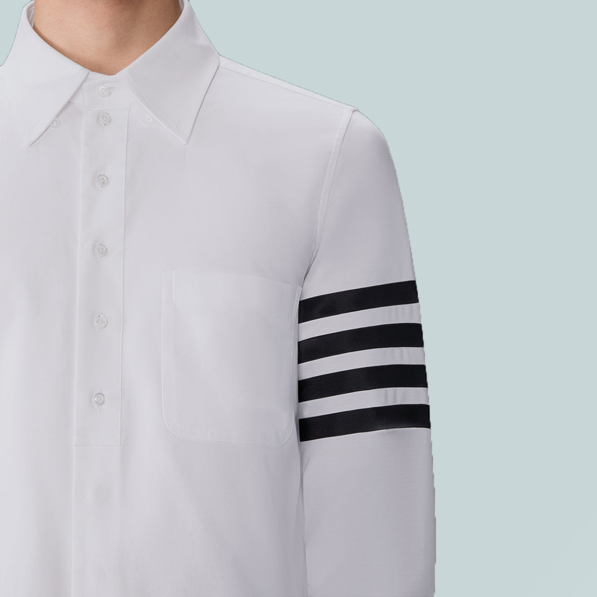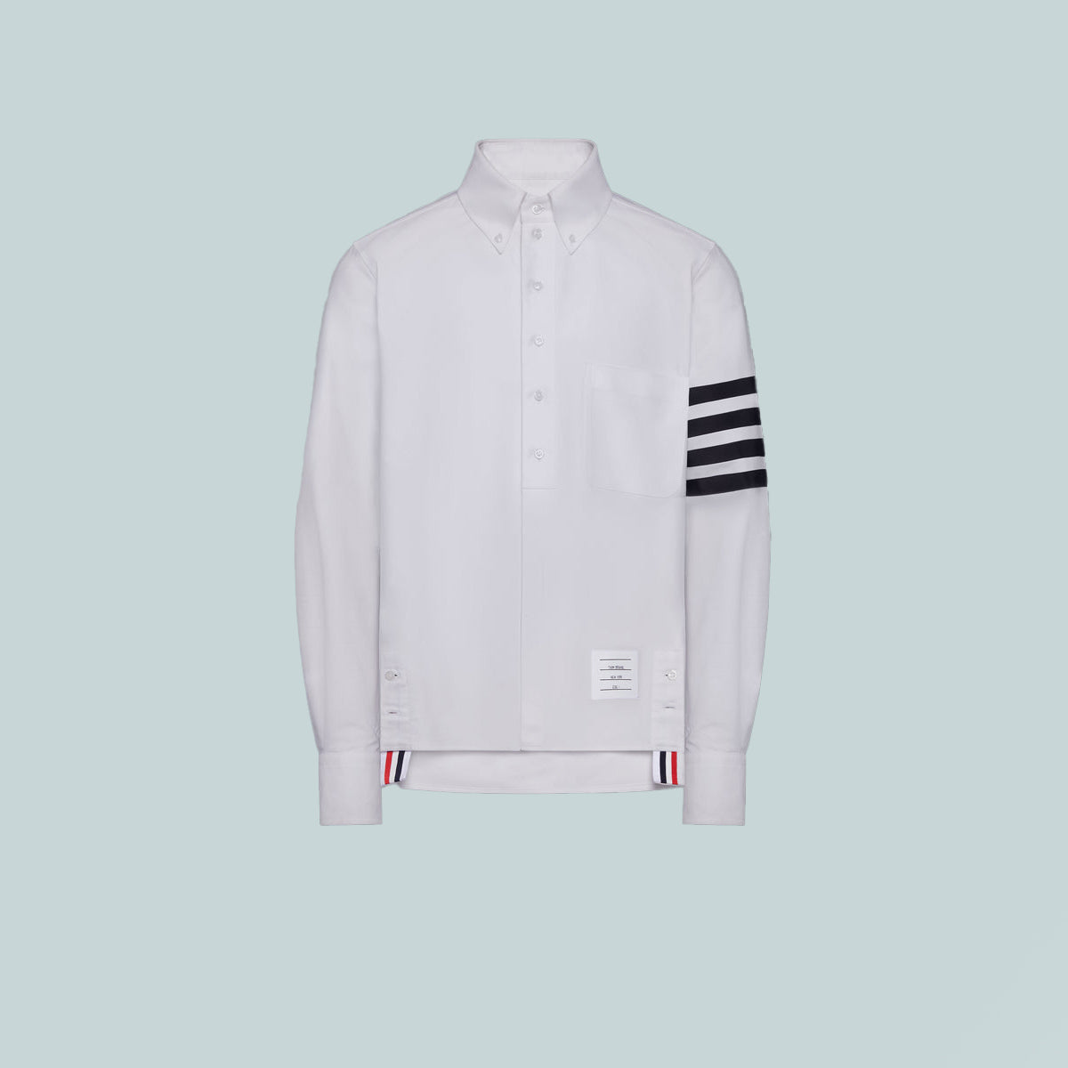 Cut in crisp cotton with a straight fit, this shirt is marked by the 4-bar motif—a recurring symbol of discipline and design clarity in the Thom Browne vocabulary. Balanced by a stepped hem and clean placket, it merges heritage shirting with a graphic assertion of identity.