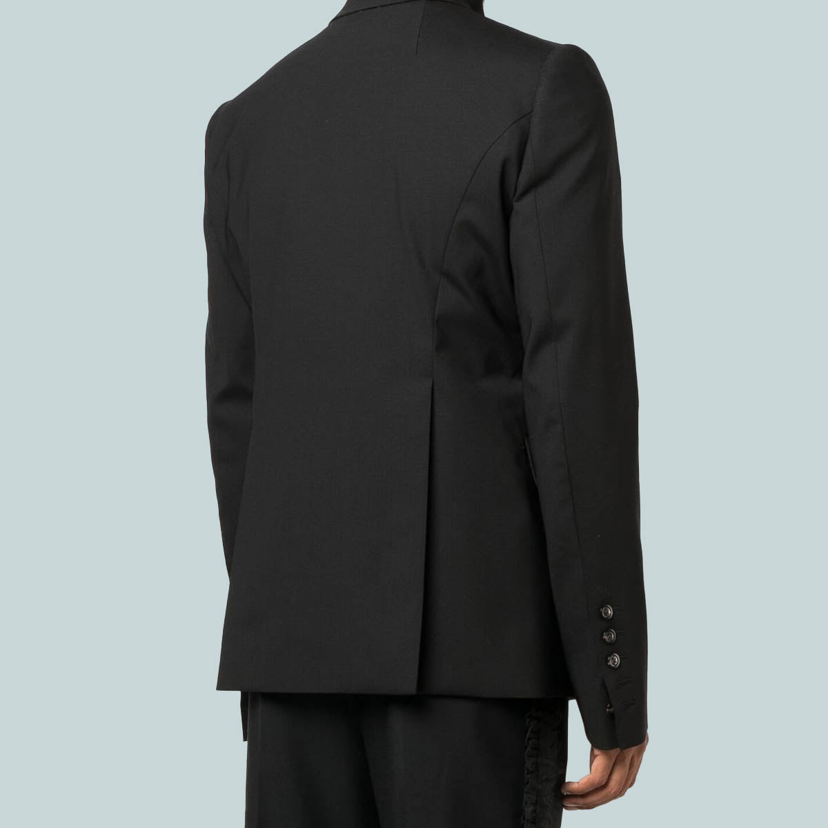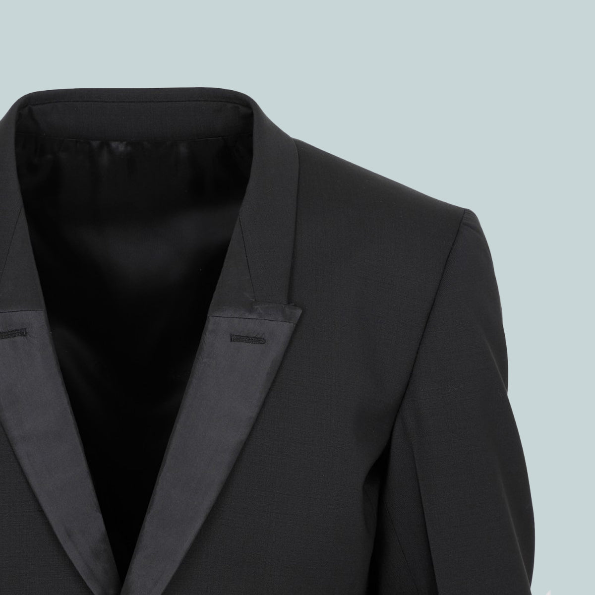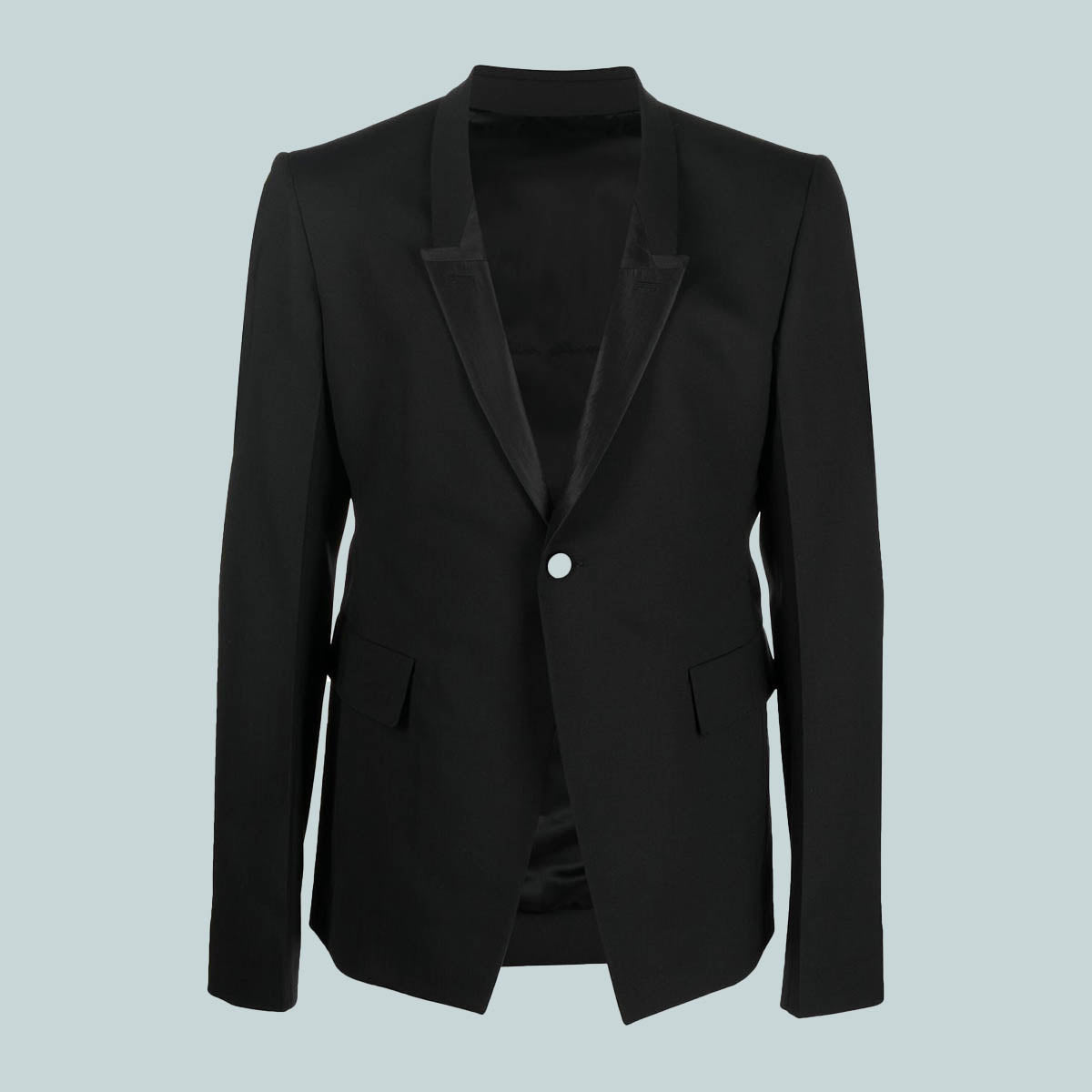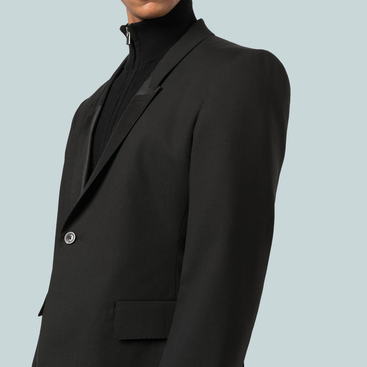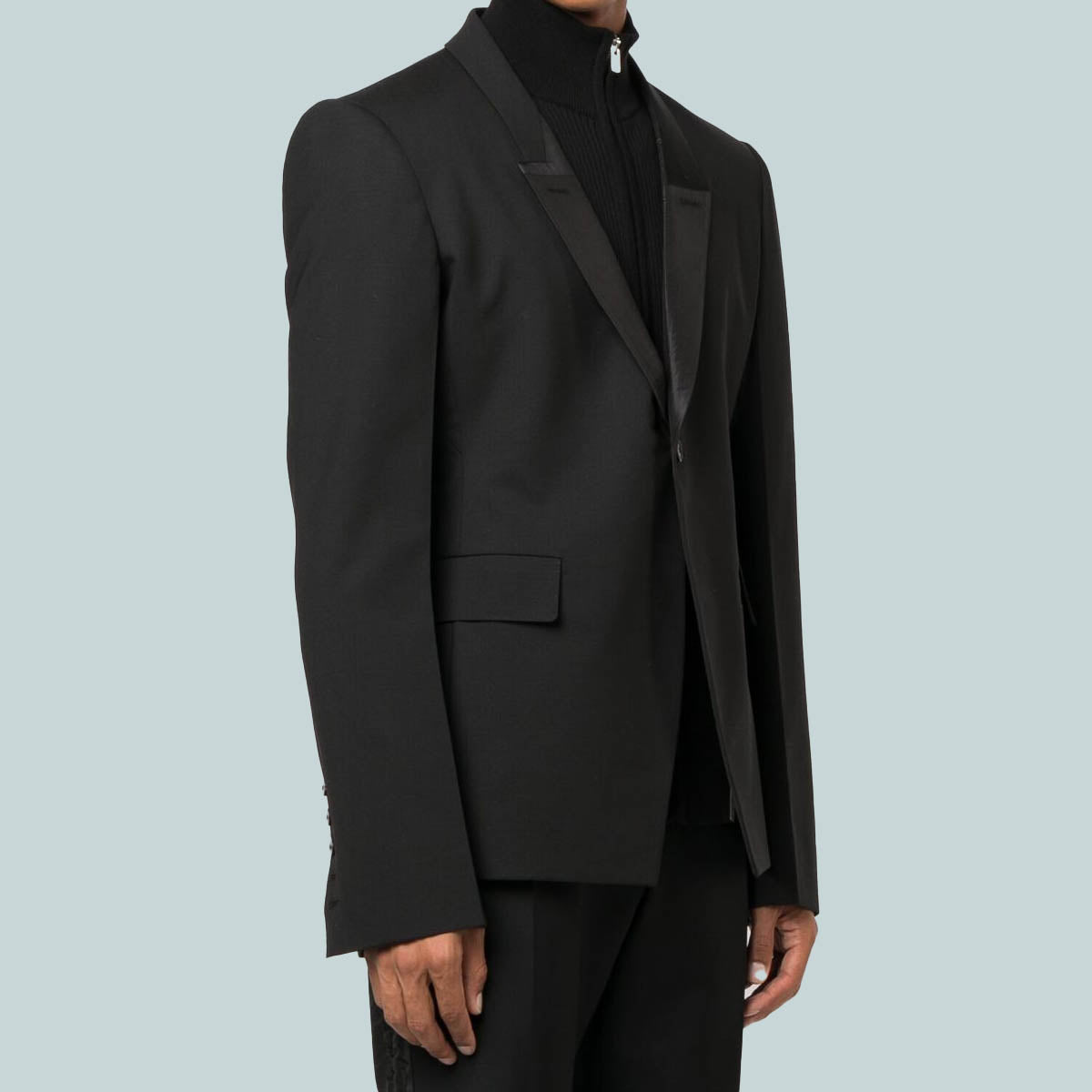 A single breasted blazer with a front button fastening and contrast fabric silk peak-lapel.