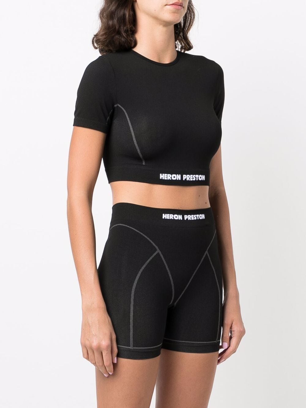 Active short sleeve cropped top in black with white contrast stitching, from the Heron Preston FW21 collection. Brand logo across waist band. Orange logo patch sewn at back. Mid weight stretch fabric.