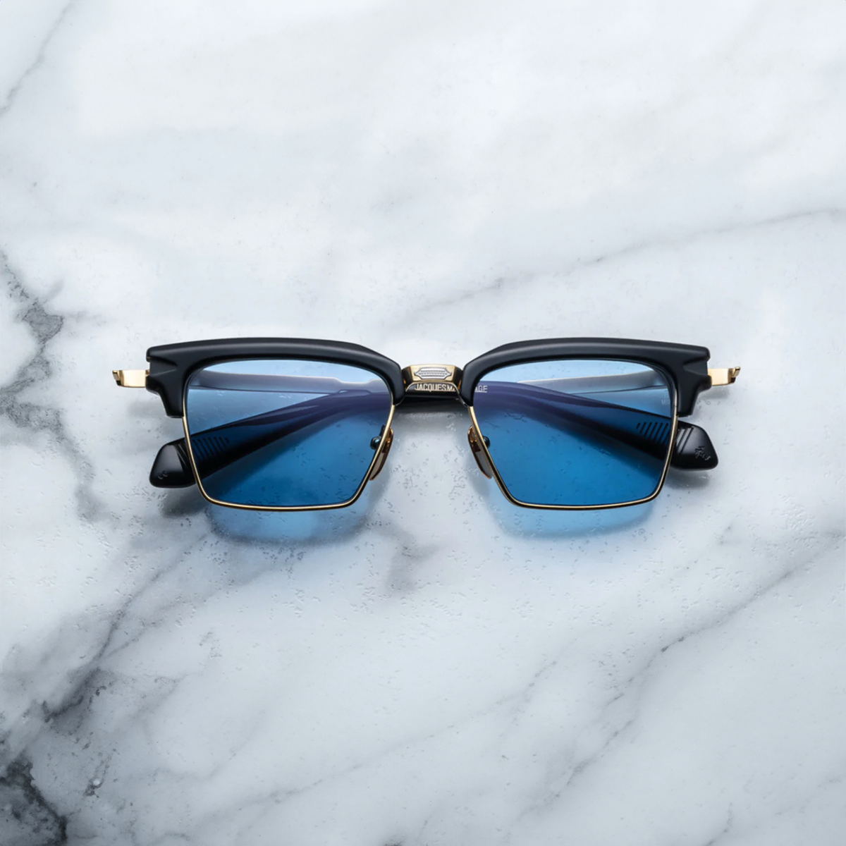Material: Moon Gold 100% Beta Titanium with Silver Accents, Black Cured Cellulose Acetate and Blue lenses