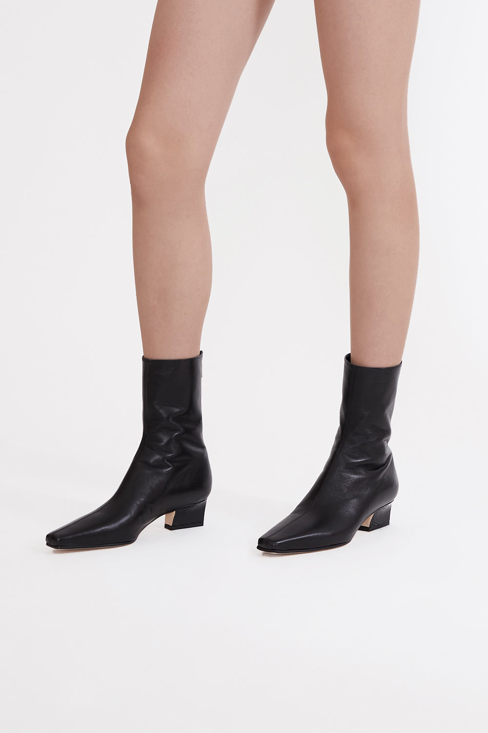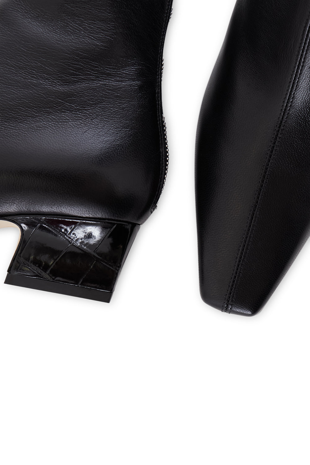 Ankle height boot in black leather from Paris Texas. Designed and crafted in Italy. Featured a low block heel of approximately ..cm. Heel is coated with black snakeskin effect leather, contrasting the smooth black leather body. Squared toe and silver zip entry at the heel.