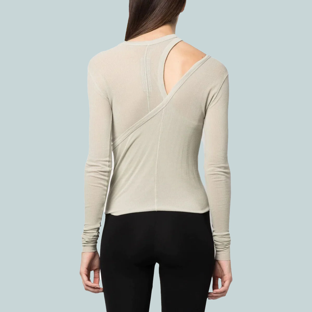 This banana ls t is below hip length with long sleeves. It is double layered with an asymmetrical neckline on top, which can be worn as a regular top, or peeled down with the top layer hanging, exposing a racer tank shoulder on the right side. It features the signature level shoulder seam on the left shoulder and single seam running down the centre back spine.