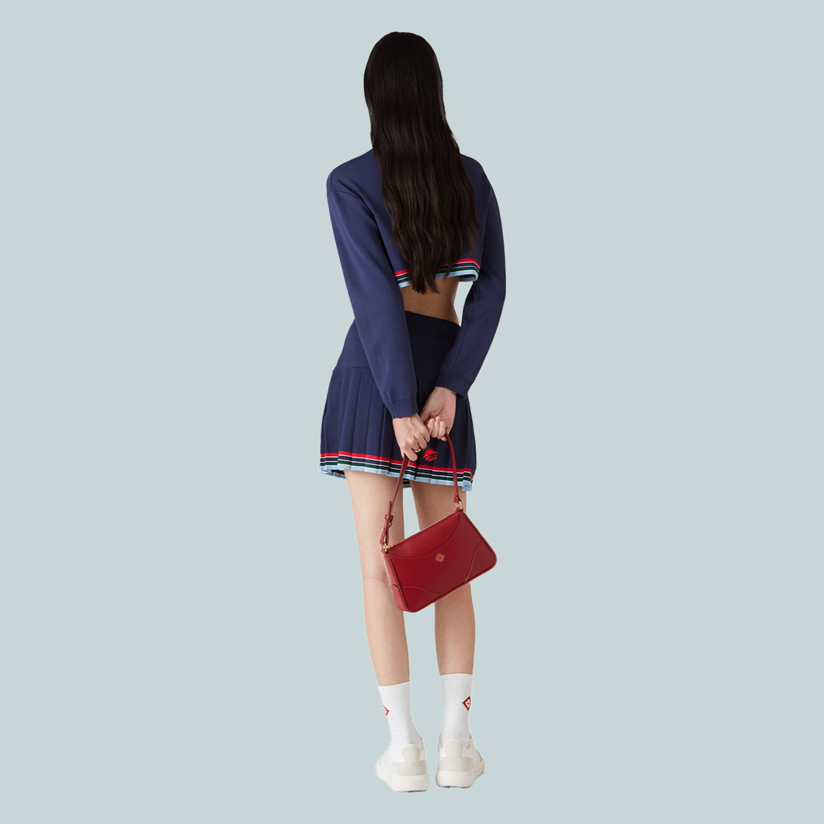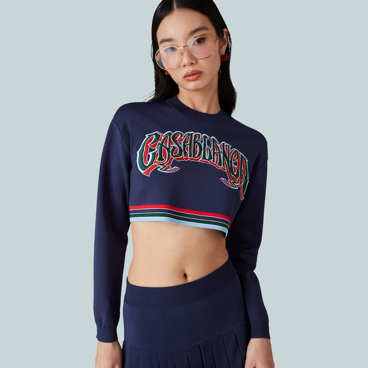 The baseball cropped jumper is crafted from a tricot fabric and features embroidered hand-drawn typography of the Casablanca logo, inspired by the gothic typeface used in tattoos. Completed with rib collar and cuffs, and a red, white, blue, green, and navy horizontal stripe detail on the hem.