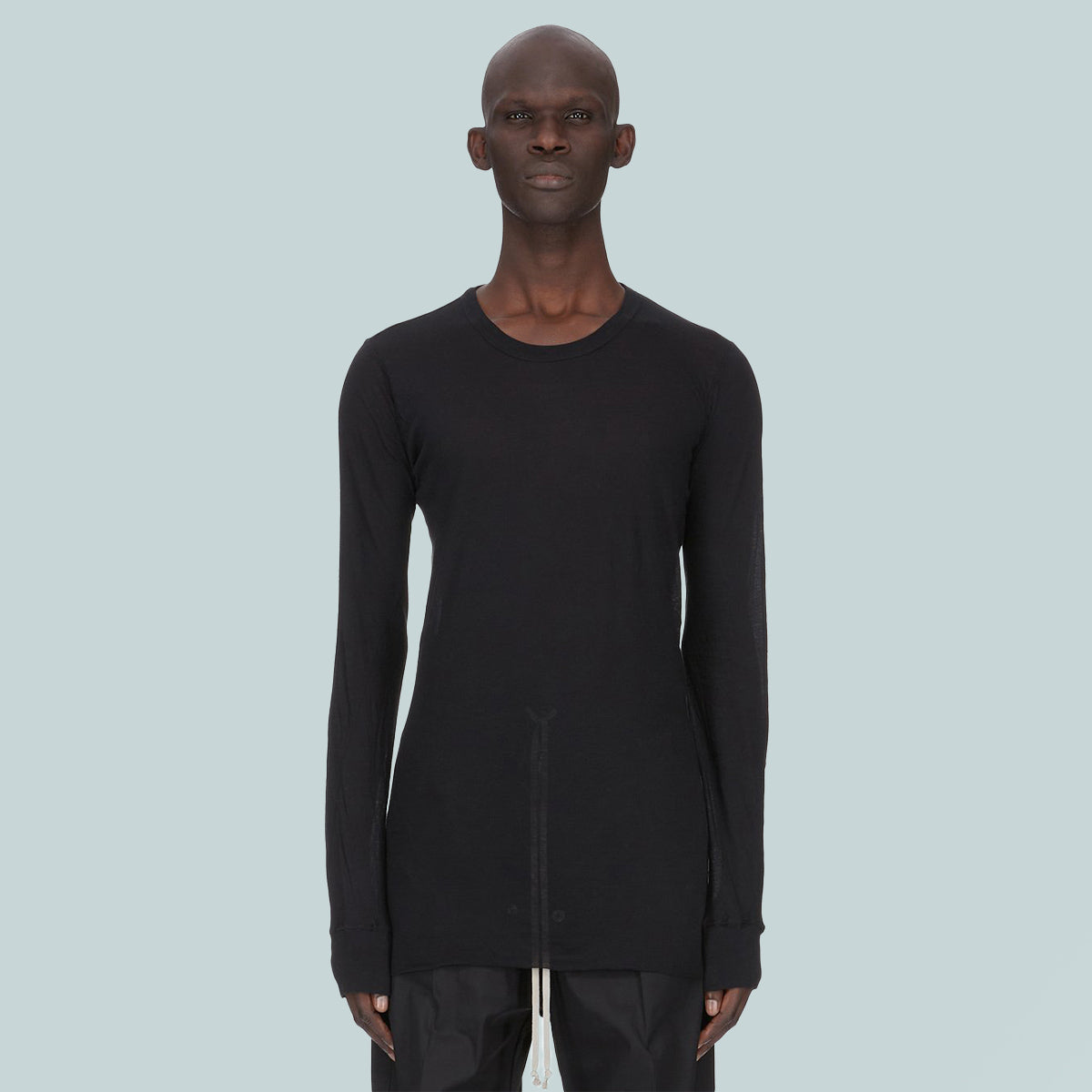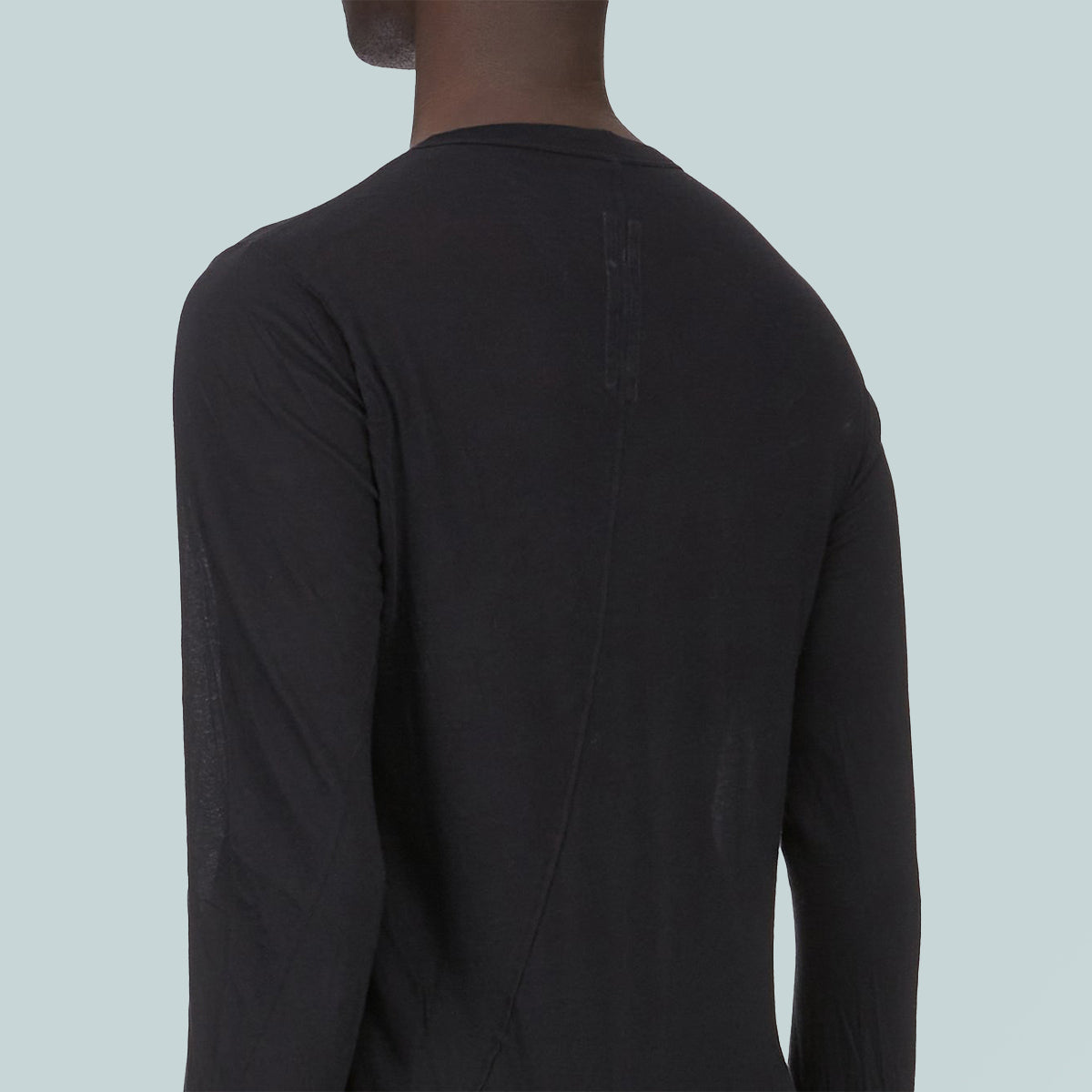 This basic ls t is below-hip length with long sleeves. it has a ribbed round neck and cuffs and a raw cut hem. it features the signature single seam running down the center back spine.
