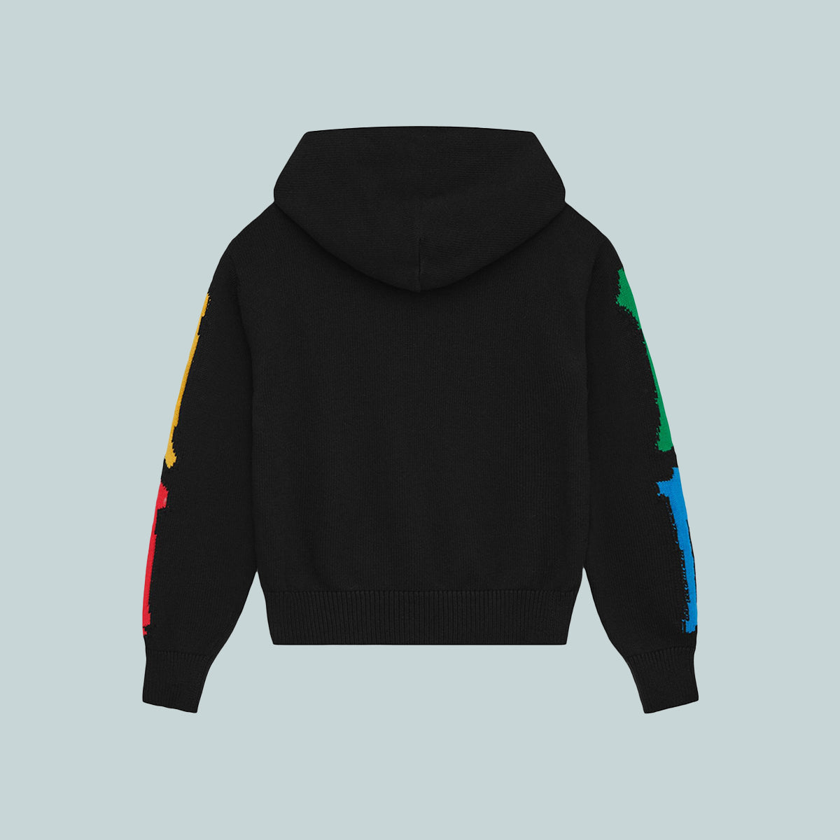 For Pre-Spring 2025, the house's signature bones motif enhances kids' knitwear. The Bones Hoodie is illustrated with colorful sleeve bone accents and features a kangaroo pocket and fine rib finishes.