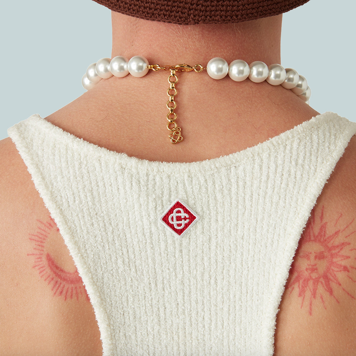 The boucle rib vest is a sleeveless textured design crafted from a boucle cotton blend fabric. Completed with a scoop neck and a racer back with the house's signature diamond logo.