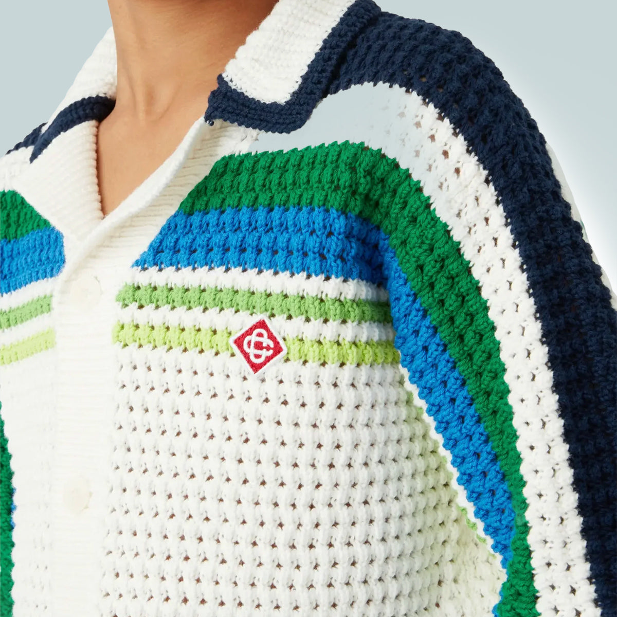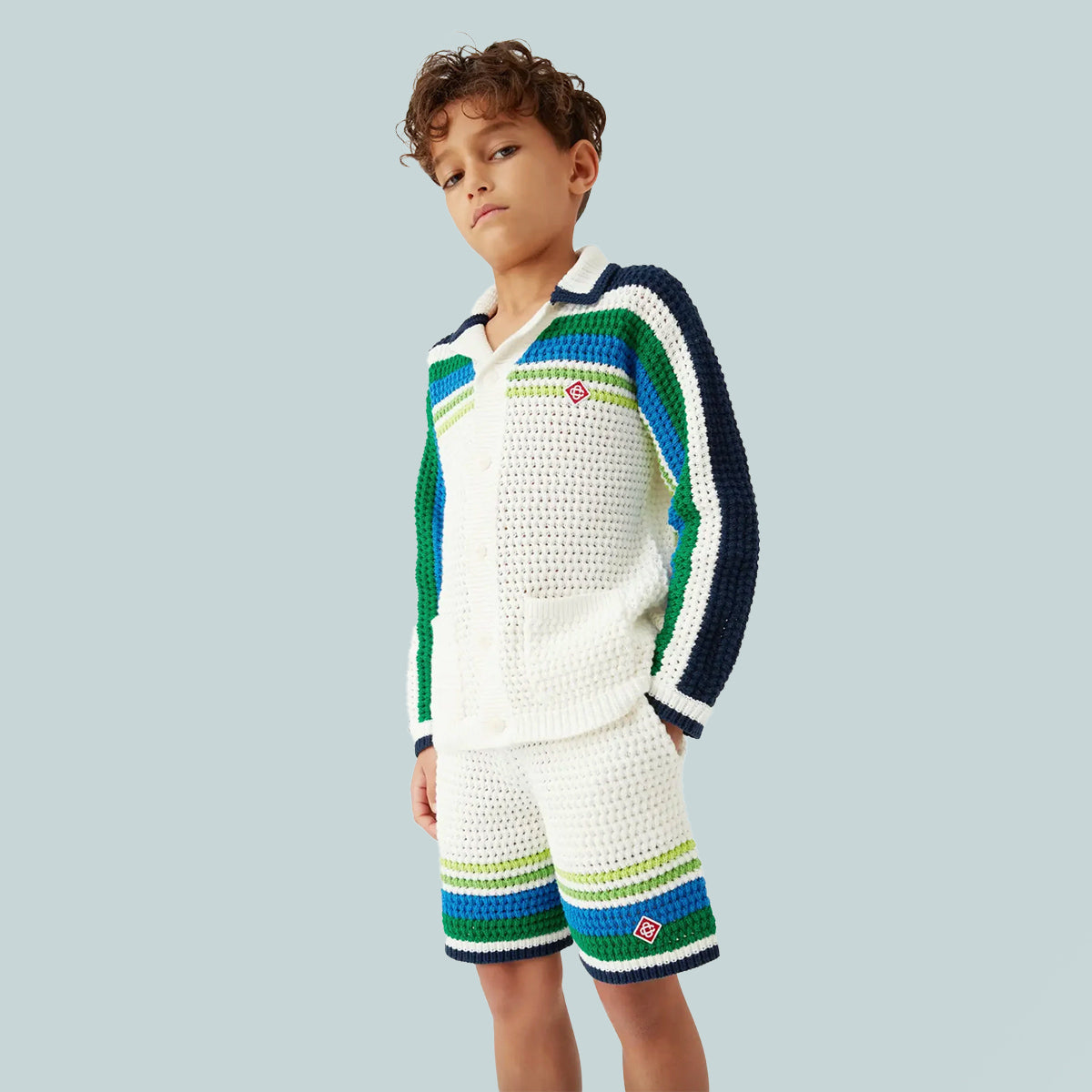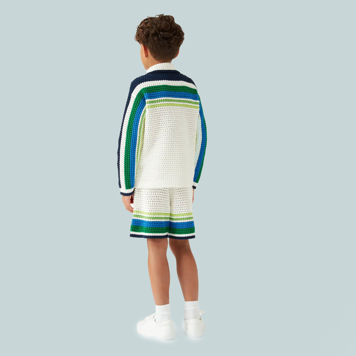 The Children's Tennis Stripe Long Sleeve Knit Shirts a long-sleeve refined cotton design featuring stripe detail across the shoulders, chest and sleeves. Completed with ribbed collar, cuffs and hem, front button closure, front patch pockets, the house's signature diamond logo, signature gold rim pearl buttons, and striped edge detail on the collar, cuffs, and hem .