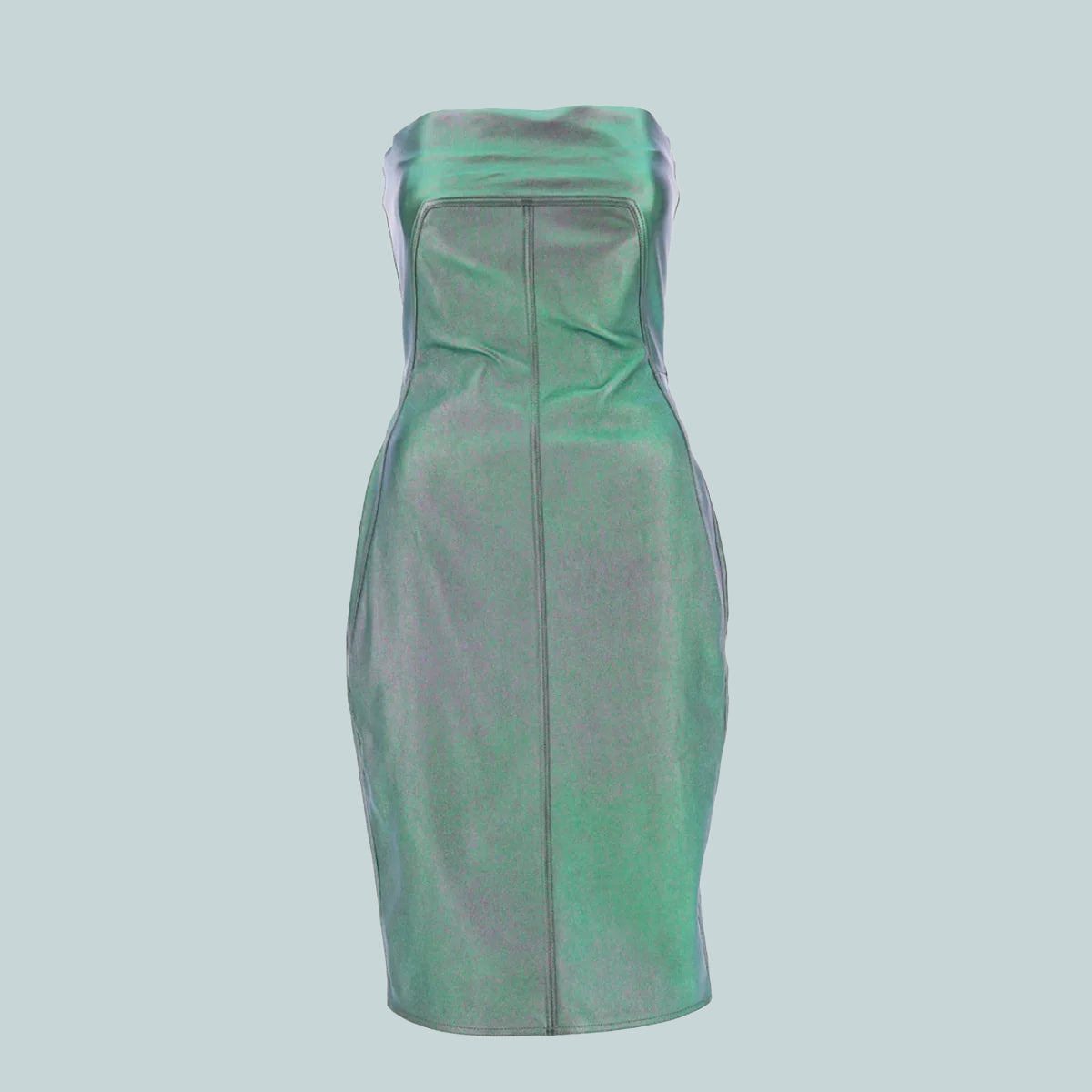 This bustier mini dress is mid-thigh length with a close-to-the-body fit. It has a strapless bustier top, asymmetrical geo seam running across the front chest and slanting diagonally down the side body. It has side front pockets and a centre back zipper.