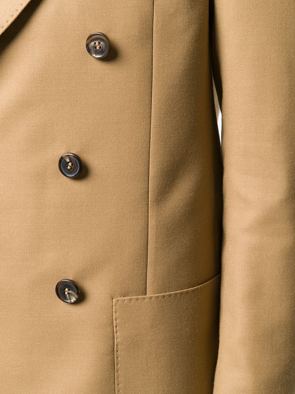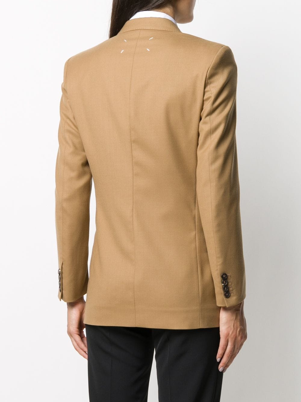 Double-breasted six buttons blazer in camel with front pockets. The piece nods to military jackets with a notch collar, wide lapels and a single-breast pocket. It's finished with the white stitch moniker at the back. Made in Italy.