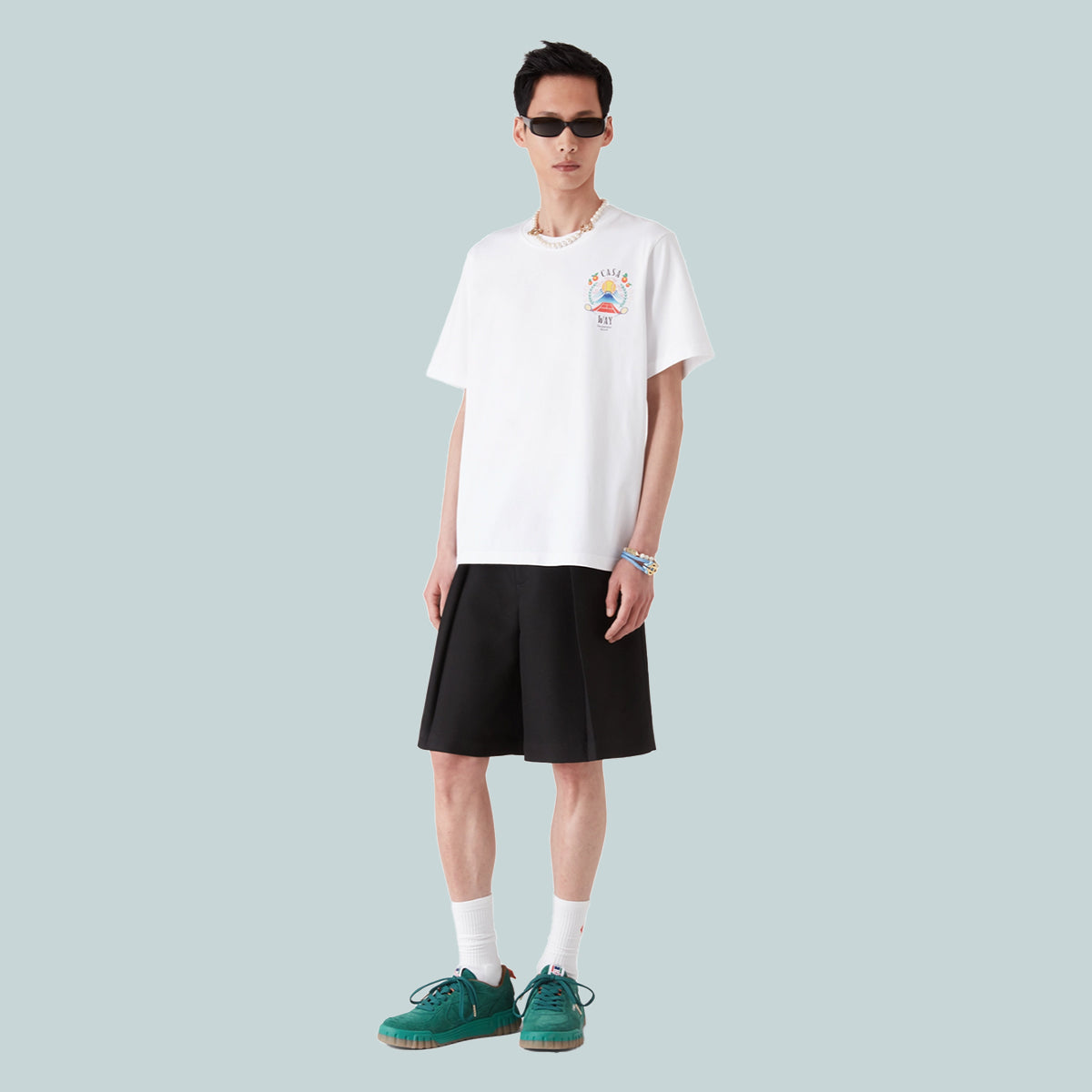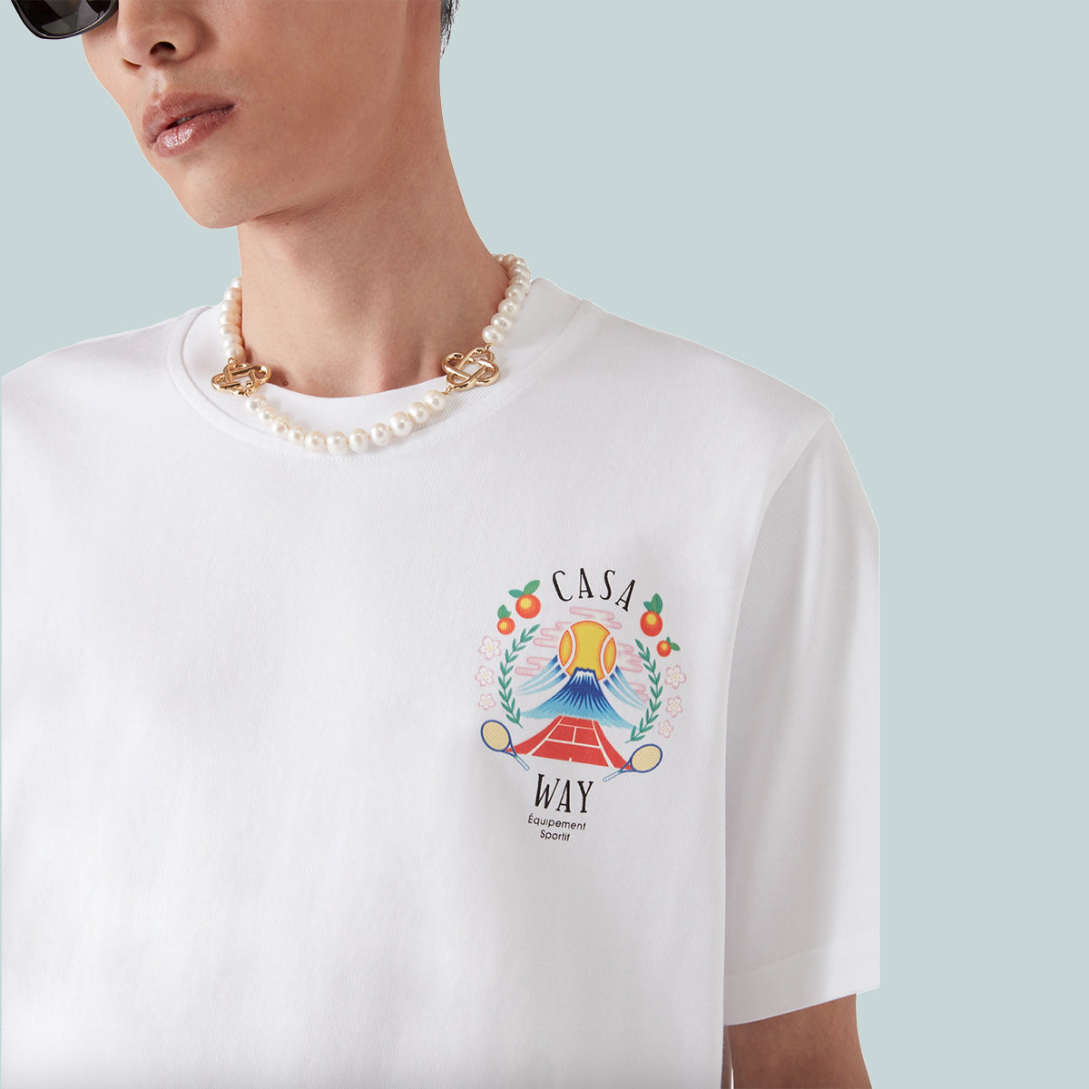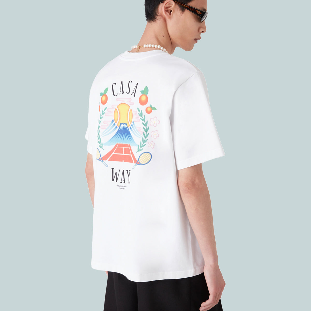 The Casa Way Mountain t-shirt is a short-sleeve design crafted from organic cotton fabric and features the house's seasonal artwork that follows the story of the iconography style we've been exploring - digitally built artwork that showcases our mountain logo, with different lines and gradient, that create a strong branding. Completed with a classic crew neck.