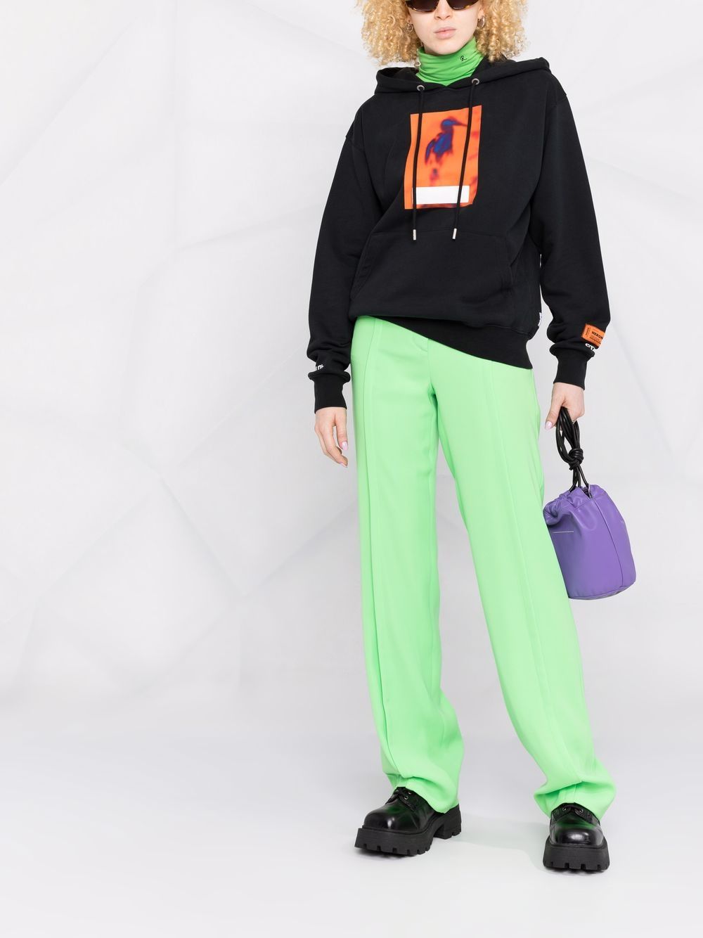 This black cotton hoodie features a light censored heron graphic print to the front and is decorated with the brand's logo patches at the sleeve and rear hem. Front pouch pocket and drawstring hood. Cut for a relaxed fit with drop shoulders.