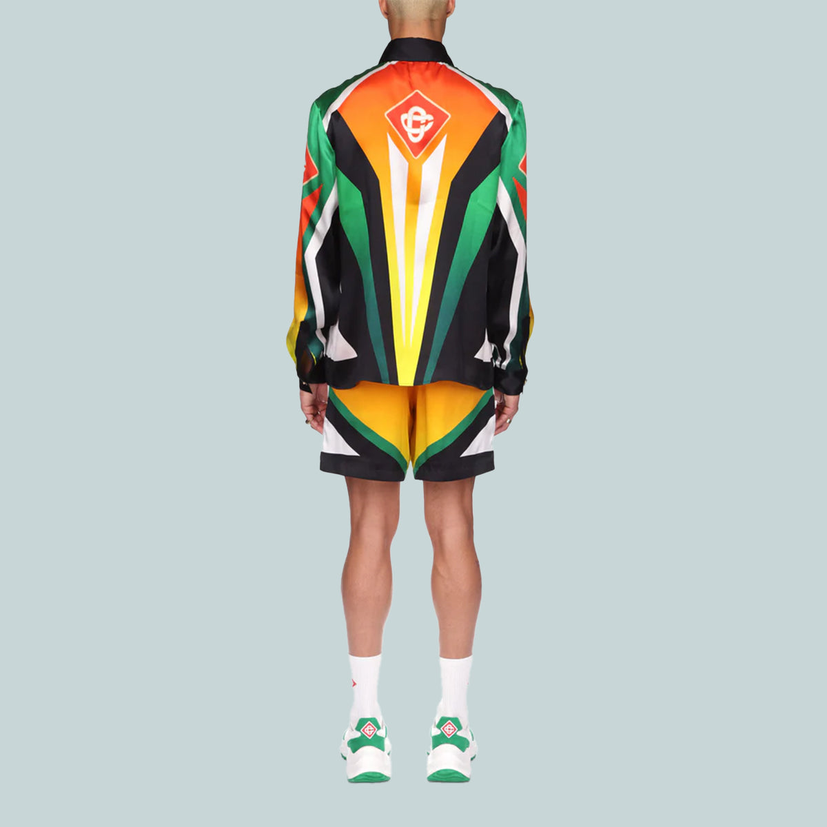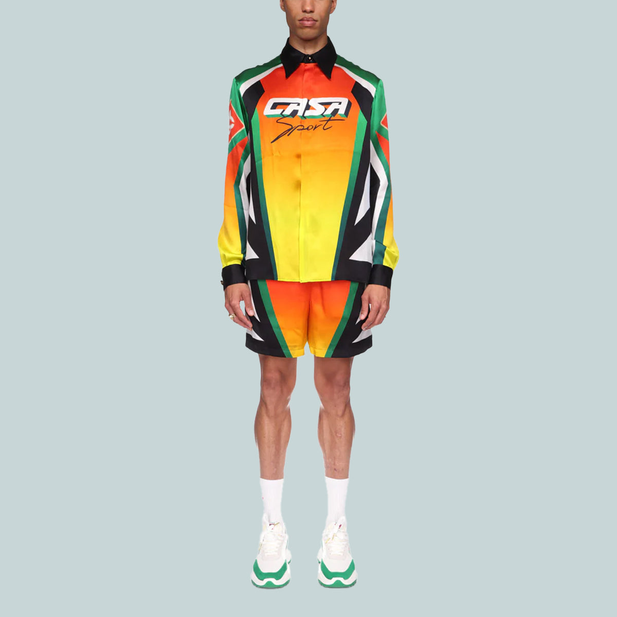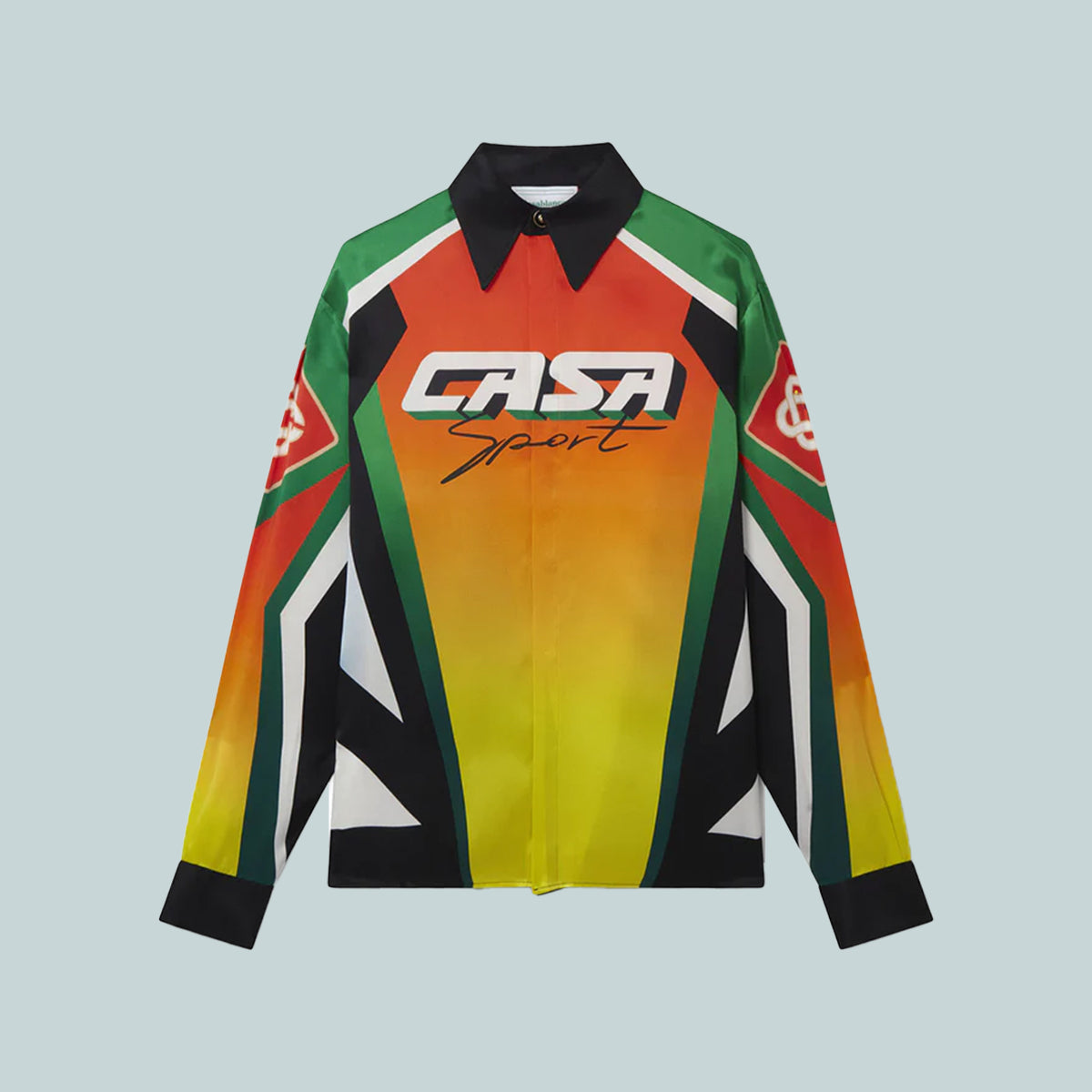 The Casa Moto Sport silk shirt is a long-sleeve printed style, crafted from a silk satin fabric, featuring panels of this season's gradient colours representing the rich exchanges across cultural disciplines in African art, music and film. Completed with the house's signature gold rim enamel buttons, button closure, black contrast point collar and cuffs.