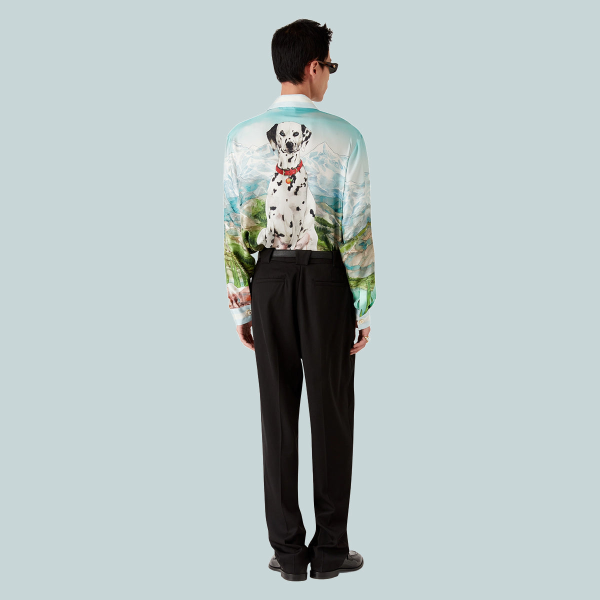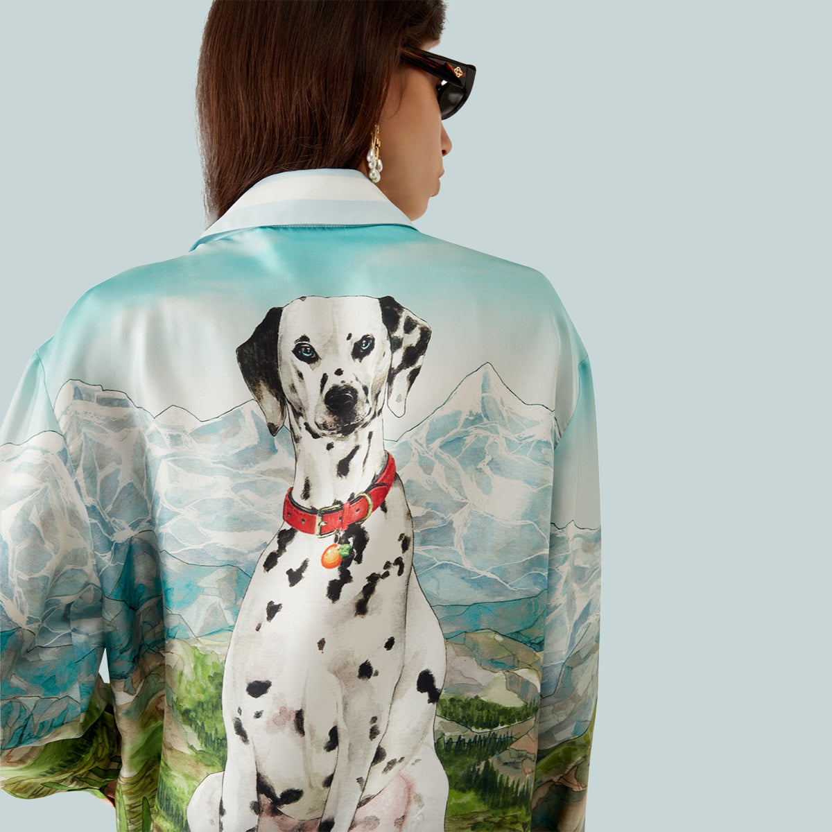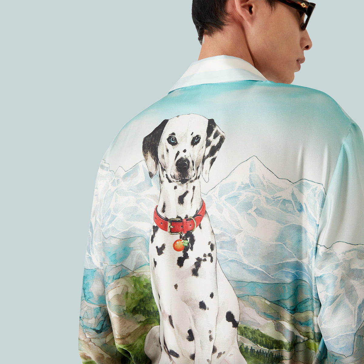 The Dalmatian A La Montagne silk long-sleeve shirt is an all-over printed design crafted from silk twill fabric featuring the house's signature artwork depicting a landscape with snow-covered mountains, lakes and a dalmatian. Completed with a collar, button closure, interlocking CC logo corozo buttons, signature pearl floral buttons at the collar and cuffs, and stripe edge detail on the collar, cuffs, hem and placket.