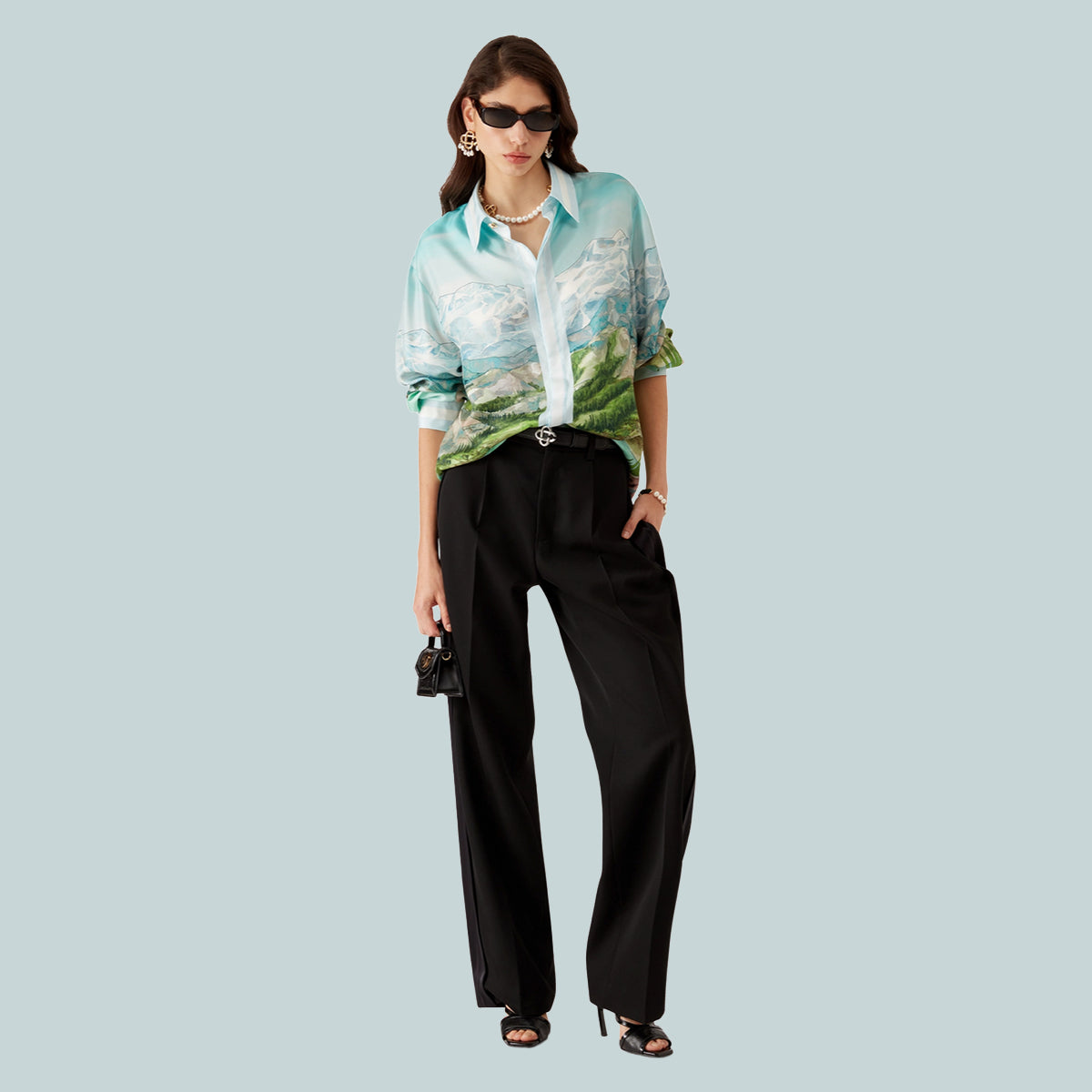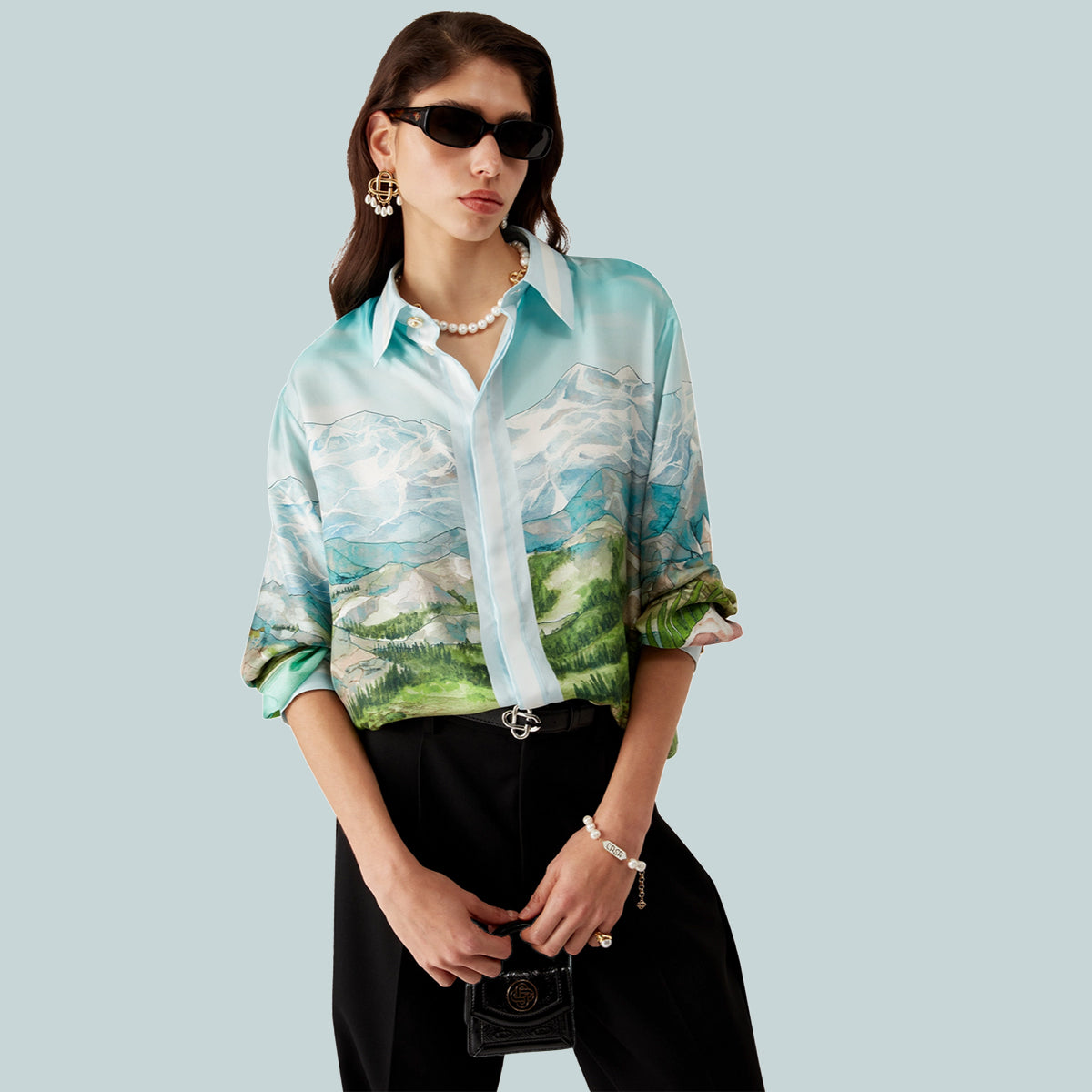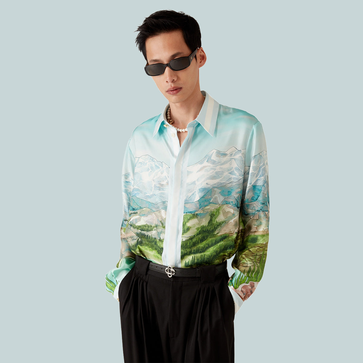 The Dalmatian A La Montagne silk long-sleeve shirt is an all-over printed design crafted from silk twill fabric featuring the house's signature artwork depicting a landscape with snow-covered mountains, lakes and a dalmatian. Completed with a collar, button closure, interlocking CC logo corozo buttons, signature pearl floral buttons at the collar and cuffs, and stripe edge detail on the collar, cuffs, hem and placket.