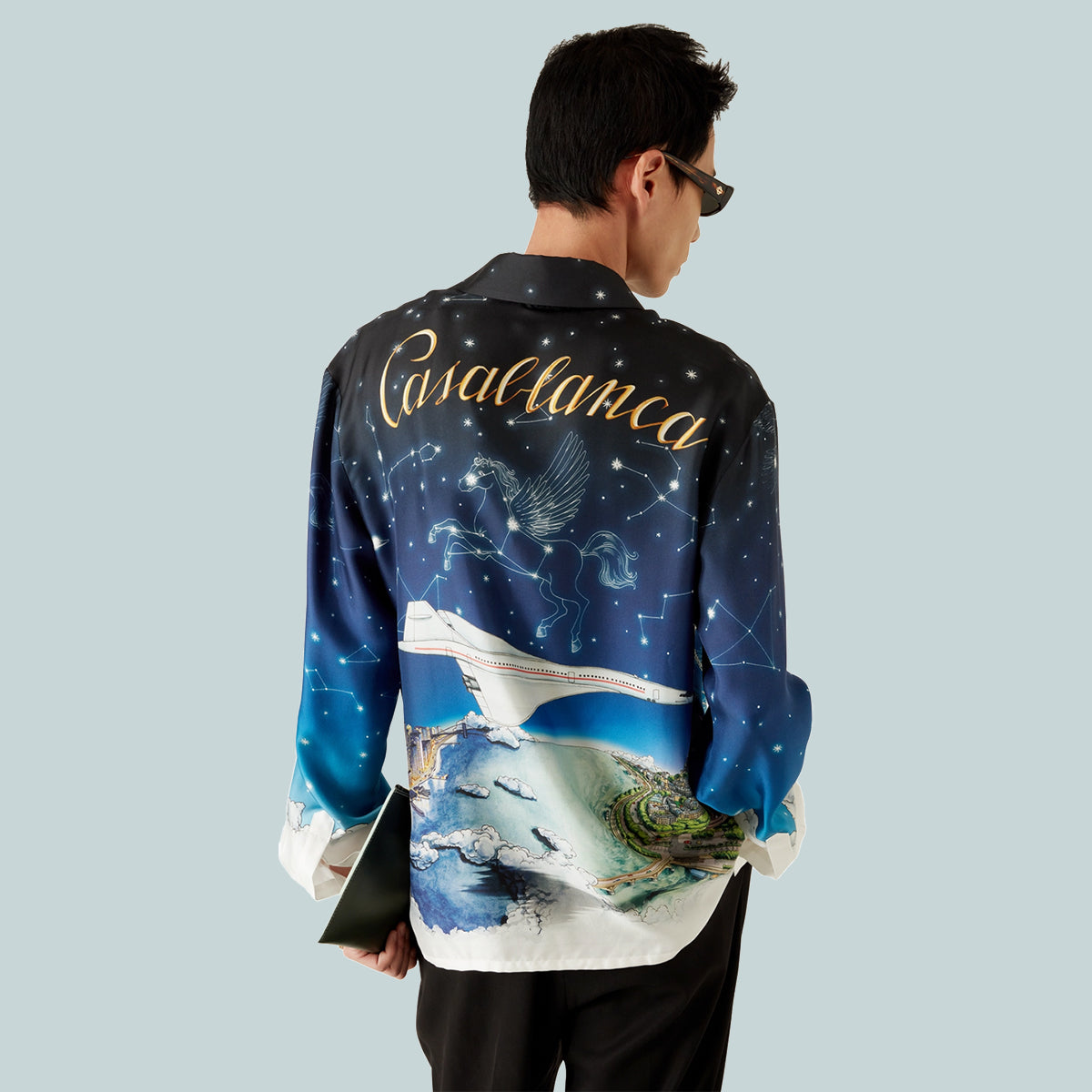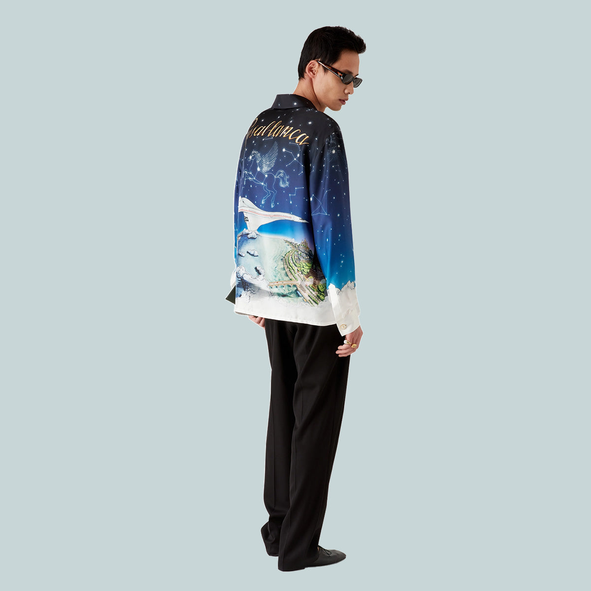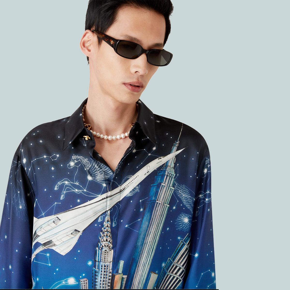 The Vol De Nuit silk shirt is a long-sleeve all-over printed design featuring artwork paying homage to the fantasy and surrealism of both the house and Charaf Tajer’s birthplace, Paris, crafted from silk twill fabric. Completed with a collar, button closure, interlocking CC logo corozo buttons, and signature gold rim pearl buttons at the collar and on the cuffs.