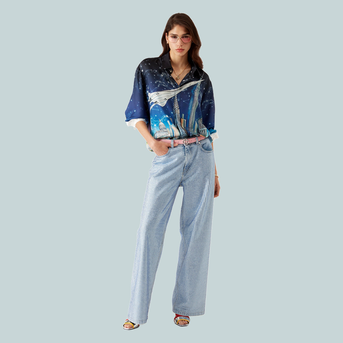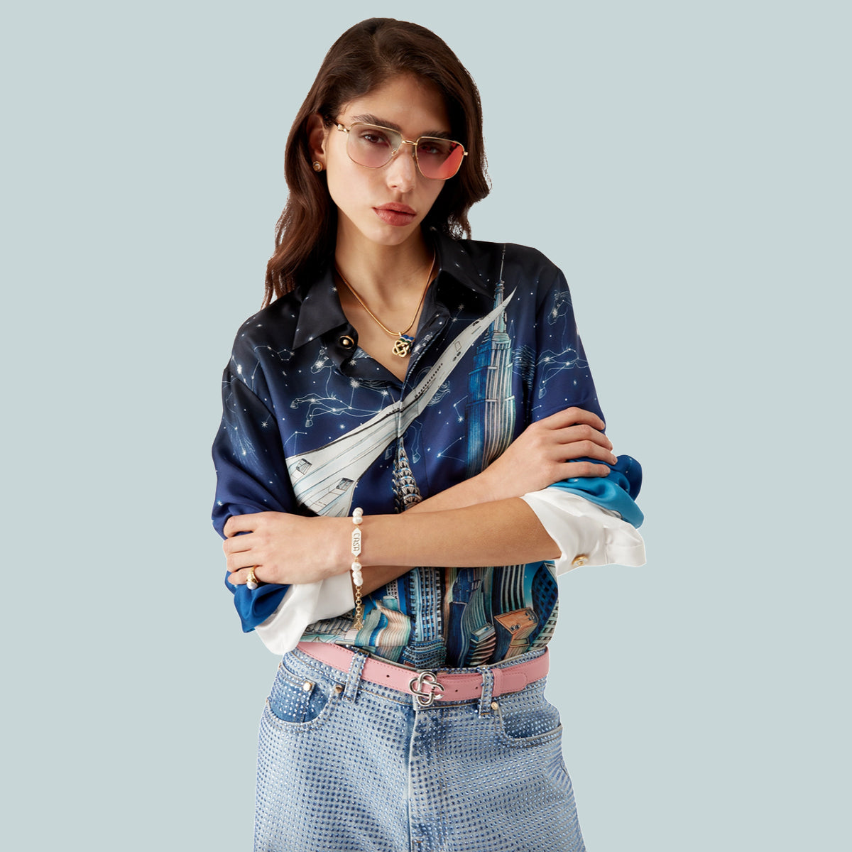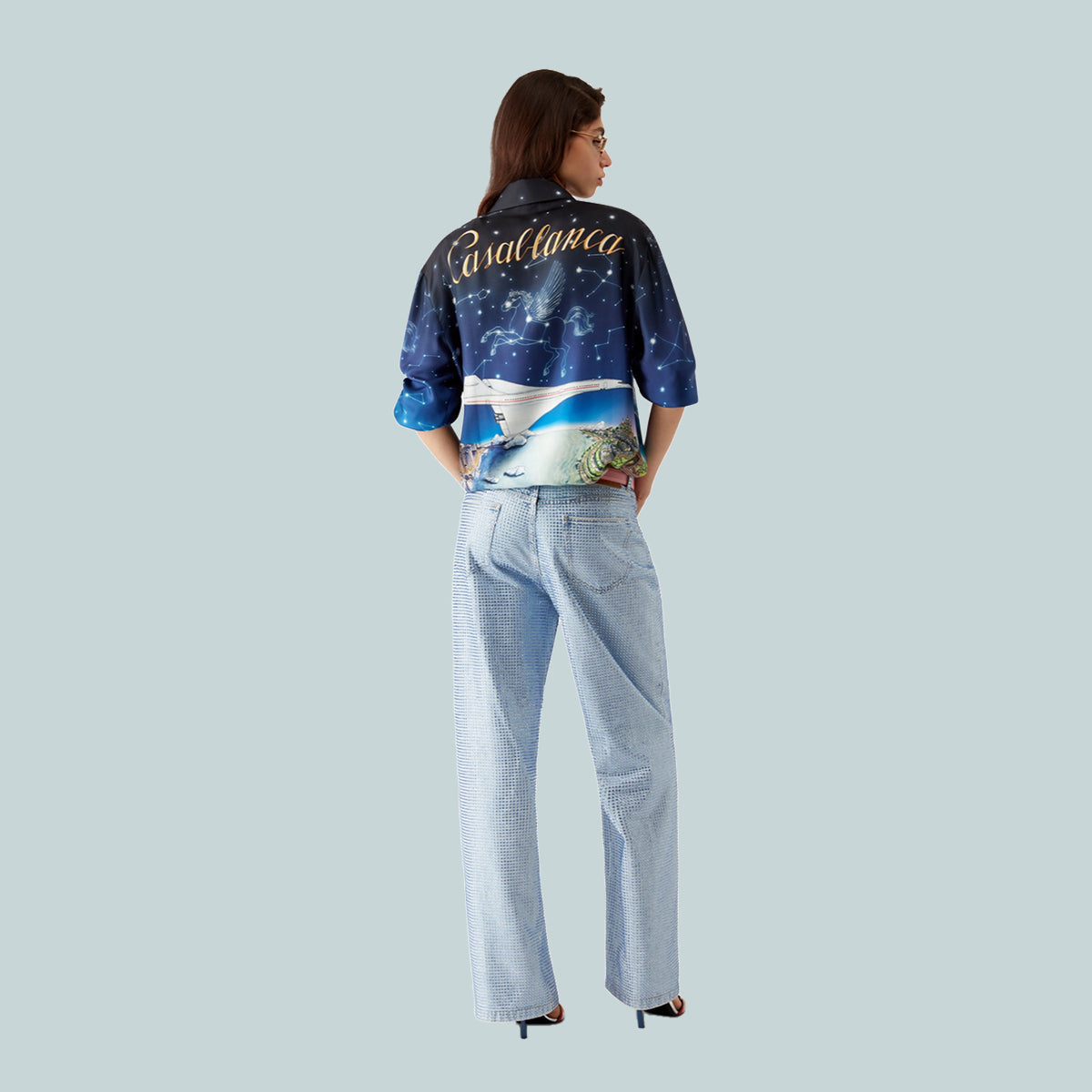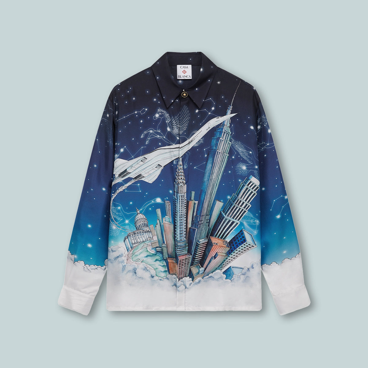The Vol De Nuit silk shirt is a long-sleeve all-over printed design featuring artwork paying homage to the fantasy and surrealism of both the house and Charaf Tajer’s birthplace, Paris, crafted from silk twill fabric. Completed with a collar, button closure, interlocking CC logo corozo buttons, and signature gold rim pearl buttons at the collar and on the cuffs.