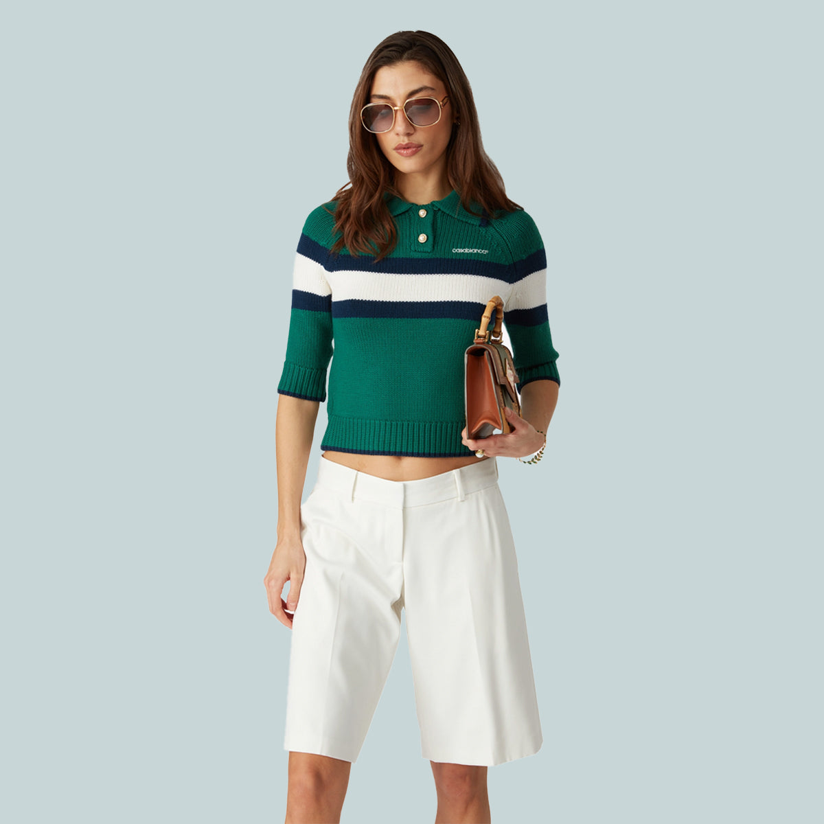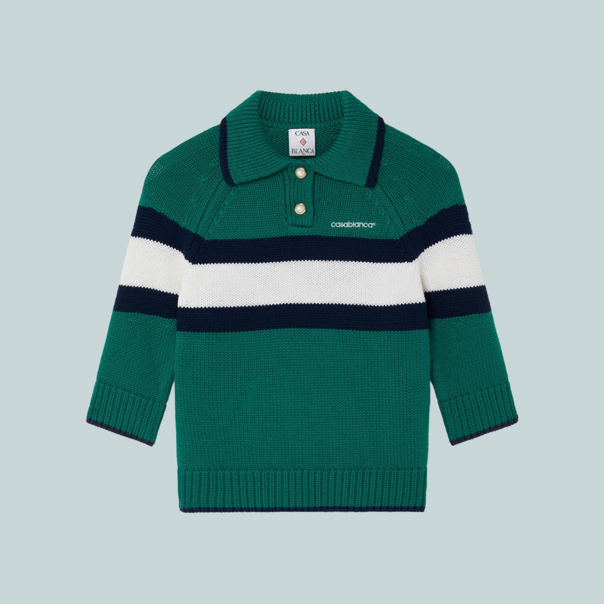 The colour block polo shirt is a cropped long-sleeve design crafted from merino wool fabric and features a blue and white stripe across the chest and back. Completed with raglan sleeves, ribbed cuffs, hem and collar, signature gold-rim pearl buttons and Casablanca logo.