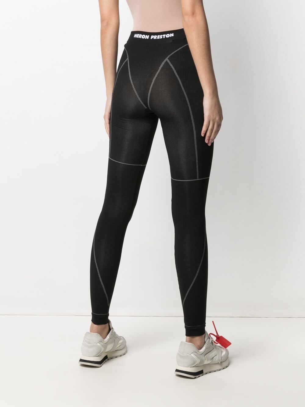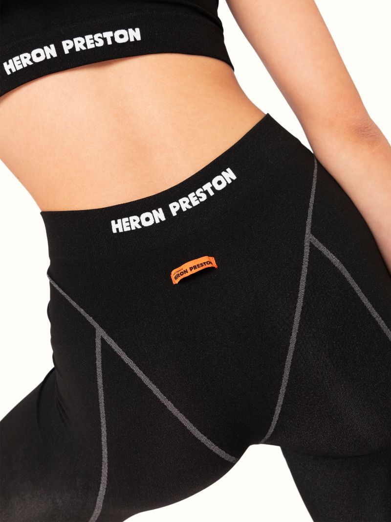 Activewear by Heron Preston. Black leggings with contrast stitching. Heron Preston logo print to the front and logo patch to the rear. High-waist. Made with lightweight stretch material.