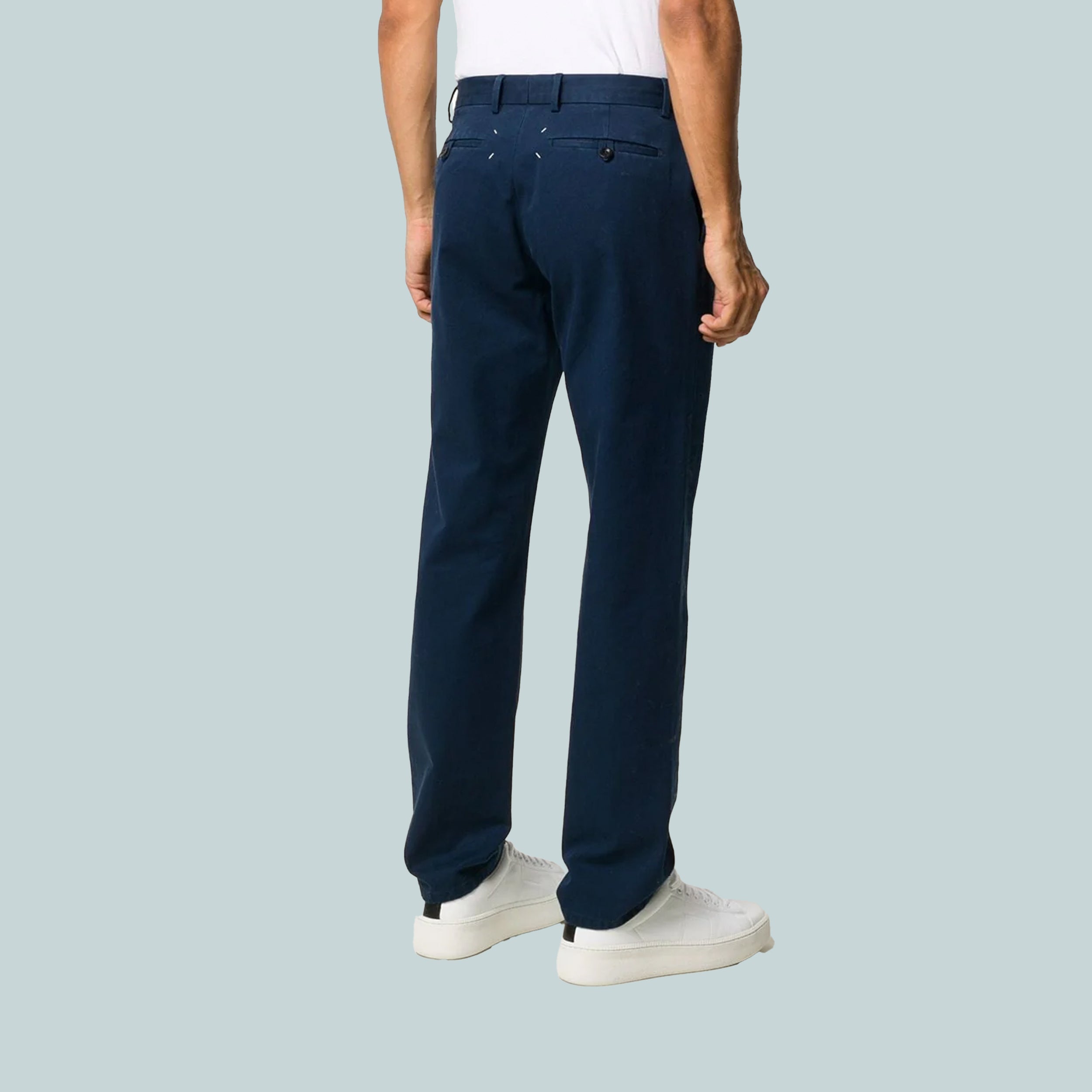 Classic chino trousers in cotton with button and fly closure, slash pockets and belt loops along with two rear buttoned leg welt pockets. The Maison's white four-stitches moniker adorns the back. Made in Italy.
