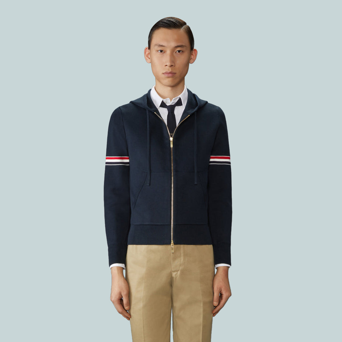 Zip hoodie in navy Milano stitch cotton with striped grosgrain armbands. 2-way zip closure, drawstring hood, slant welt side pockets. Buttoned cuffs with signature striped grosgrain trim.