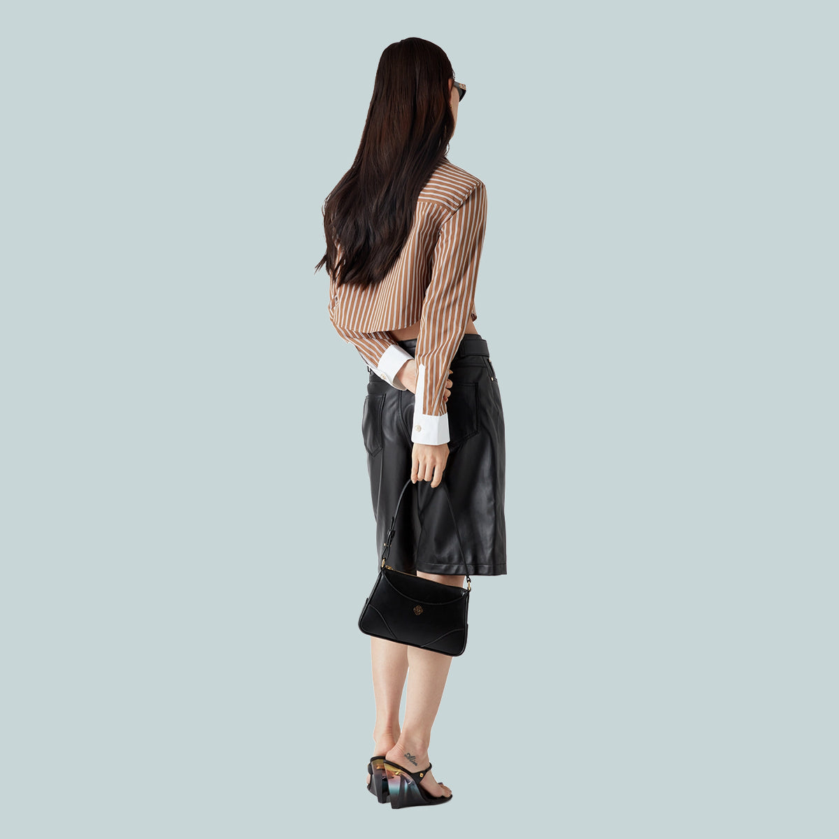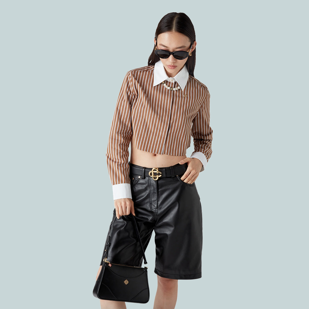 The stripe cropped long-sleeve shirt is a short style crafted from a cotton barré fabric. Completed with button closure, interlocking CC logo corozo buttons, signature gold rim pearl button at the collar, contrast white point collar and cuffs and a curved hem.