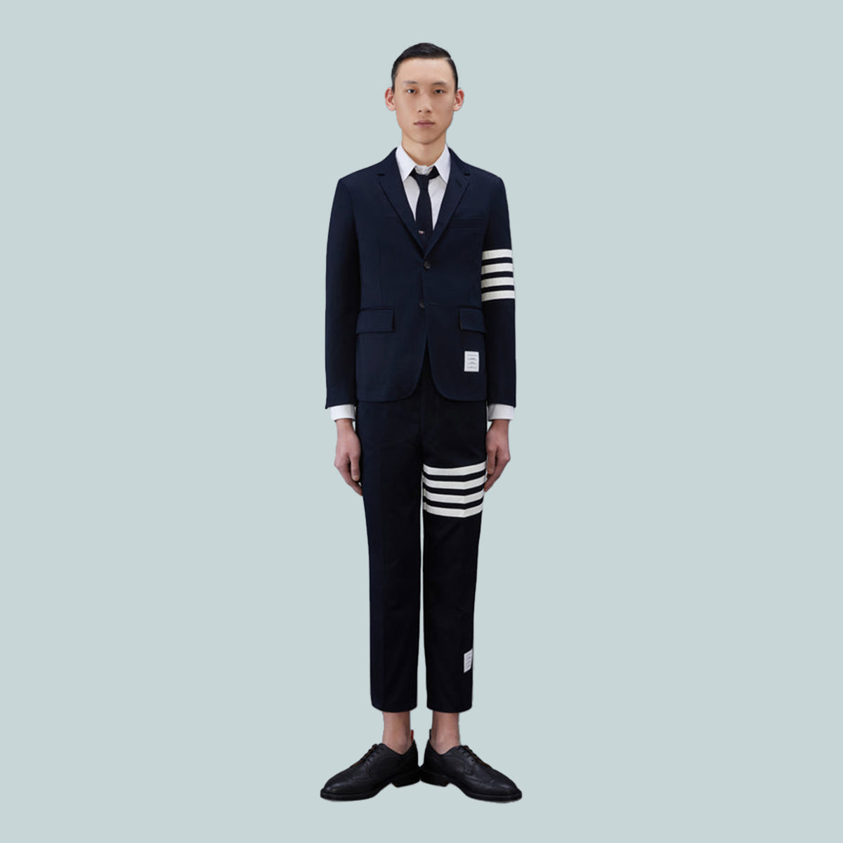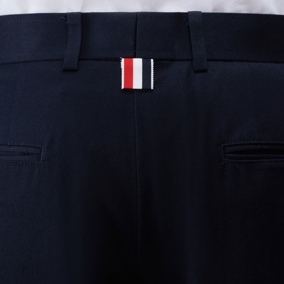 Our Cotton Twill 4-Bar Unconstructed Chino Trouser. A classic shortened hem pays homage to Thom Browne distinguished tailoring, while two signature Thom Browne emblems adorn the left leg, our signature 4-Bar stripe and nametag applique.