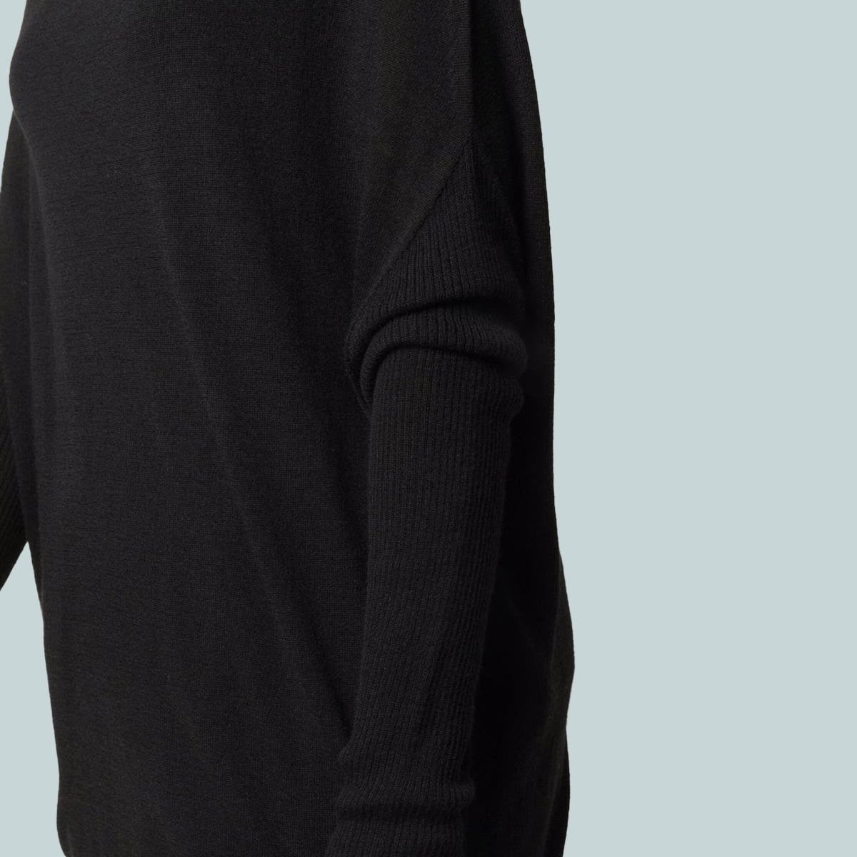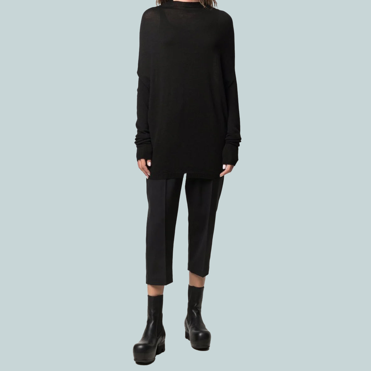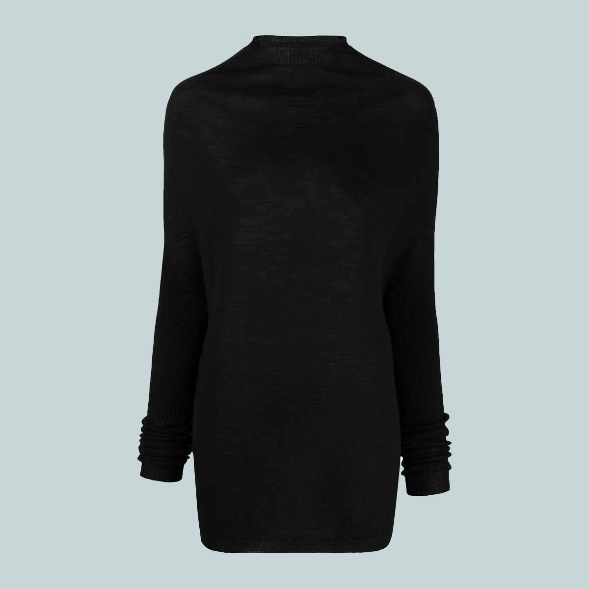 Knit wool long sleeve top in black from the Rick Owens FW21 GETHSEMANE collection. Features a high neck line, drop shoulders, and rib knit sleeves.