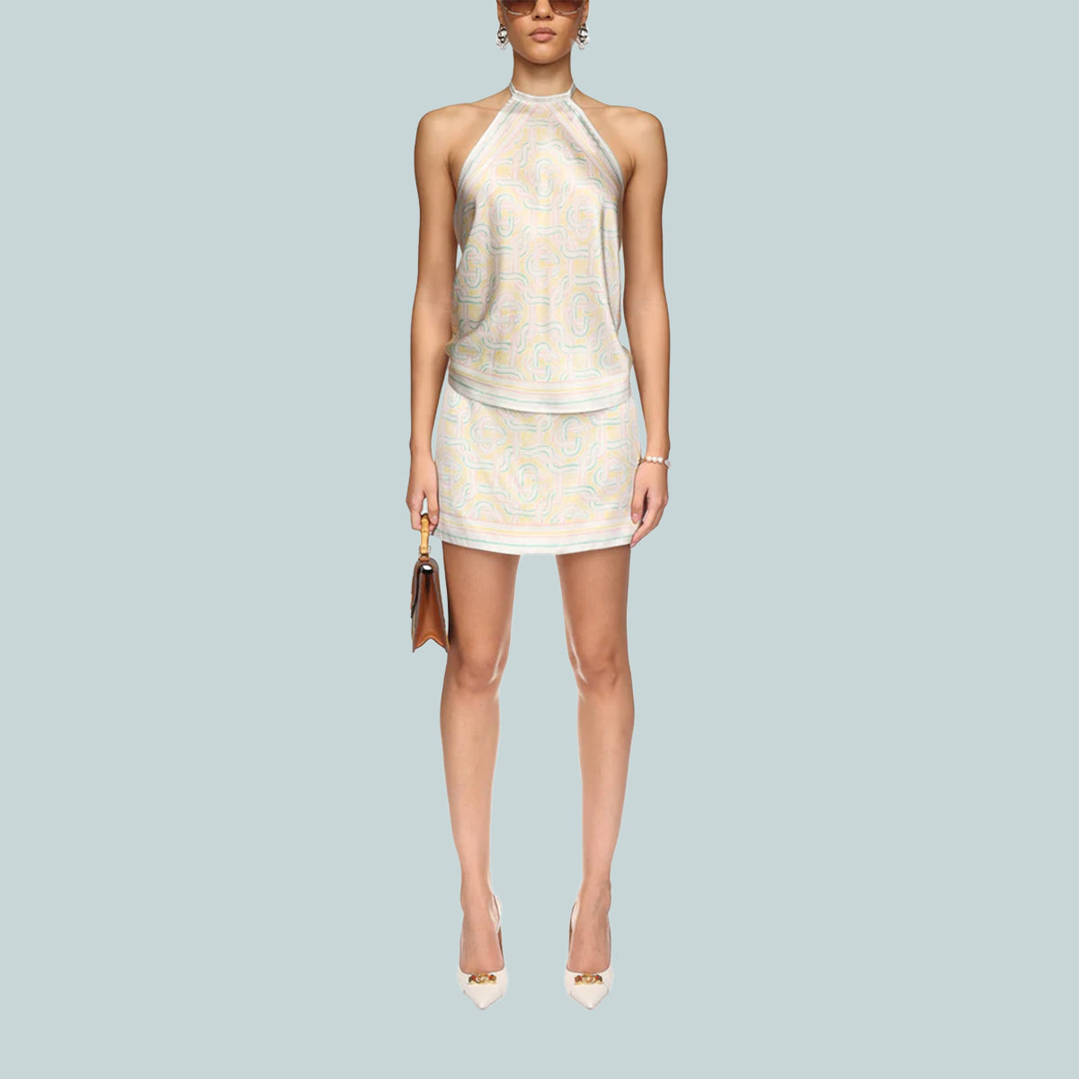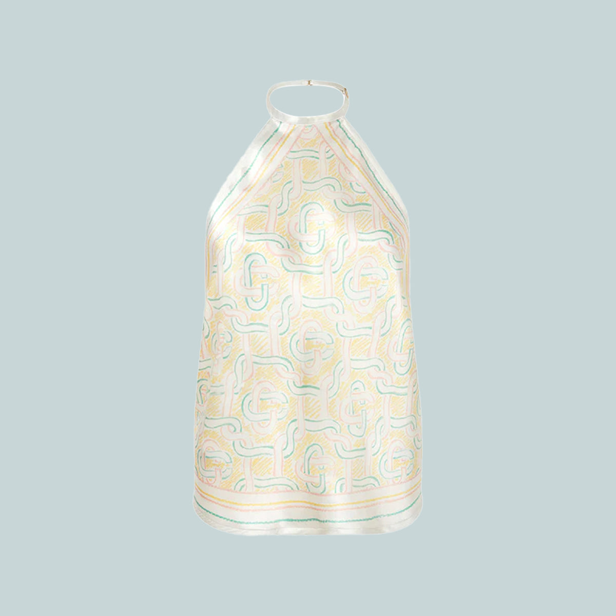 The Crayon monogram silk scarf top is a halter neck design featuring a classic monogram design, recreated using crayons to create a free-hand sketch look with pastel colours. Crafted from a printed silk satin fabric and completed with an adjustable neck fastening - designed to be fastened by tying the fabric at the back.