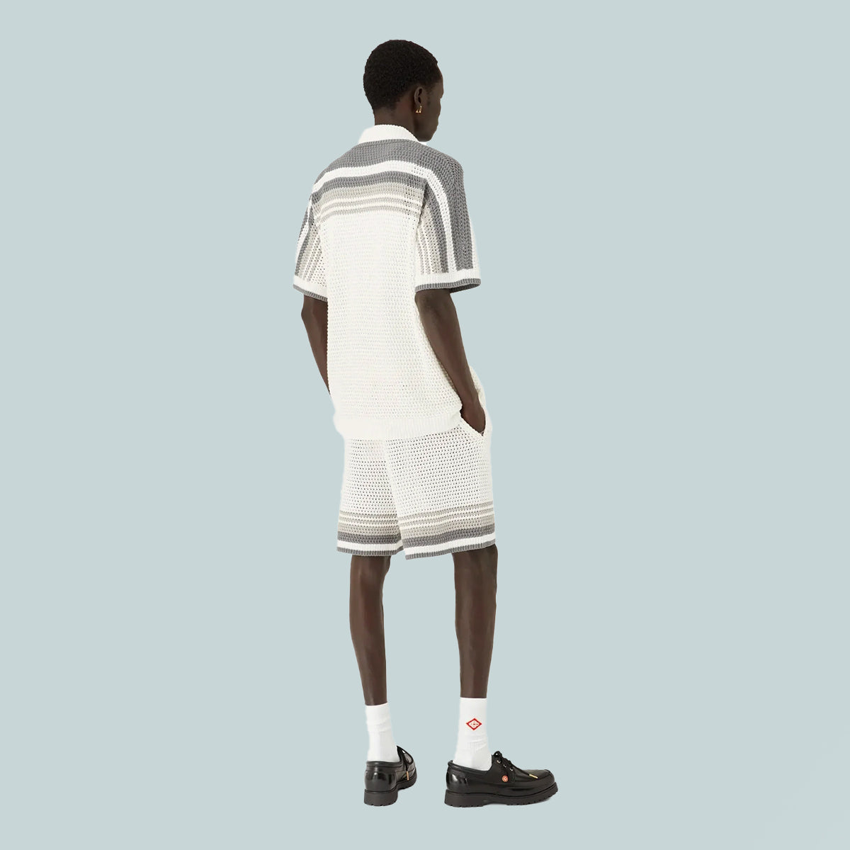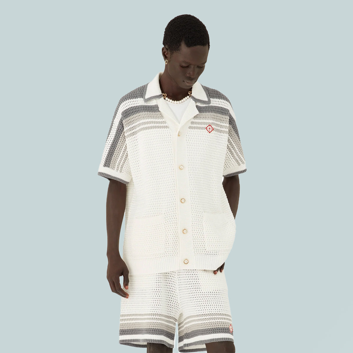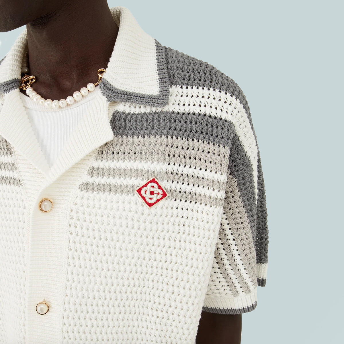 The tennis crochet shirt is a knitted design crafted from a crochet cotton fabric featuring stripe detail across the shoulders, chest and sleeves. Finished with ribbed collar, cuffs and hem with stripe detail, front button closure, front patch pockets and signature gold rim pearl buttons.