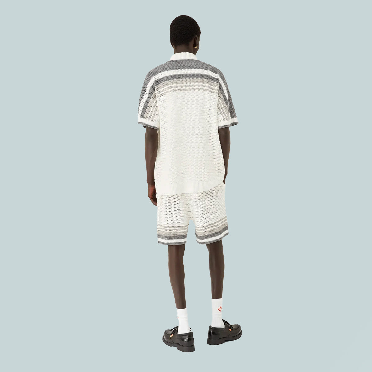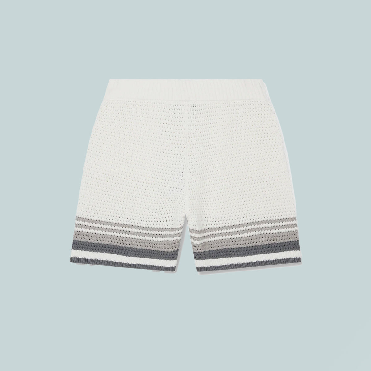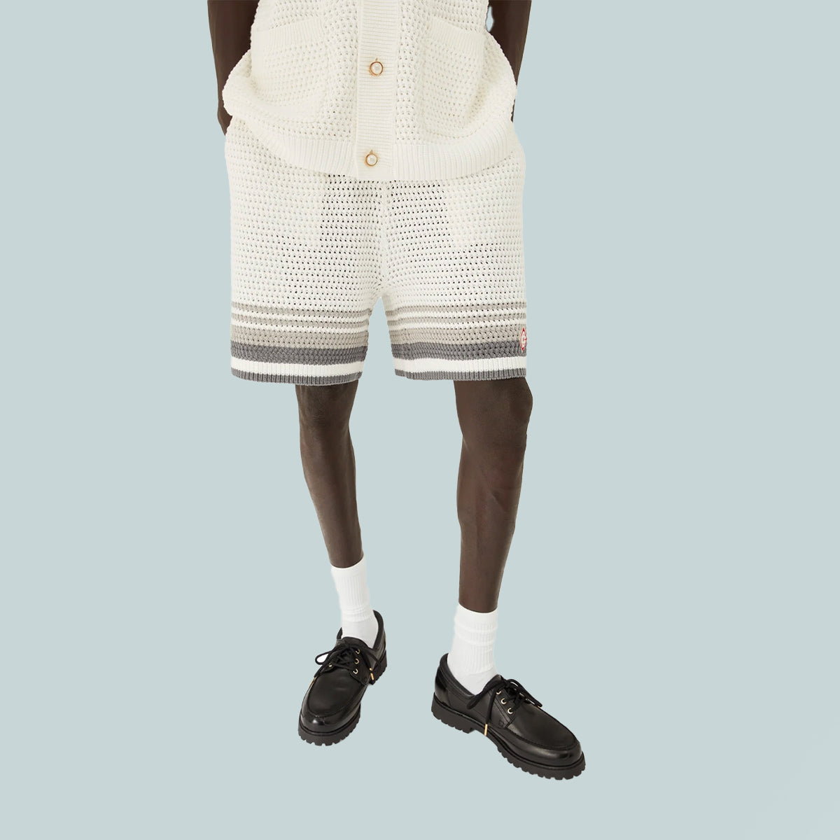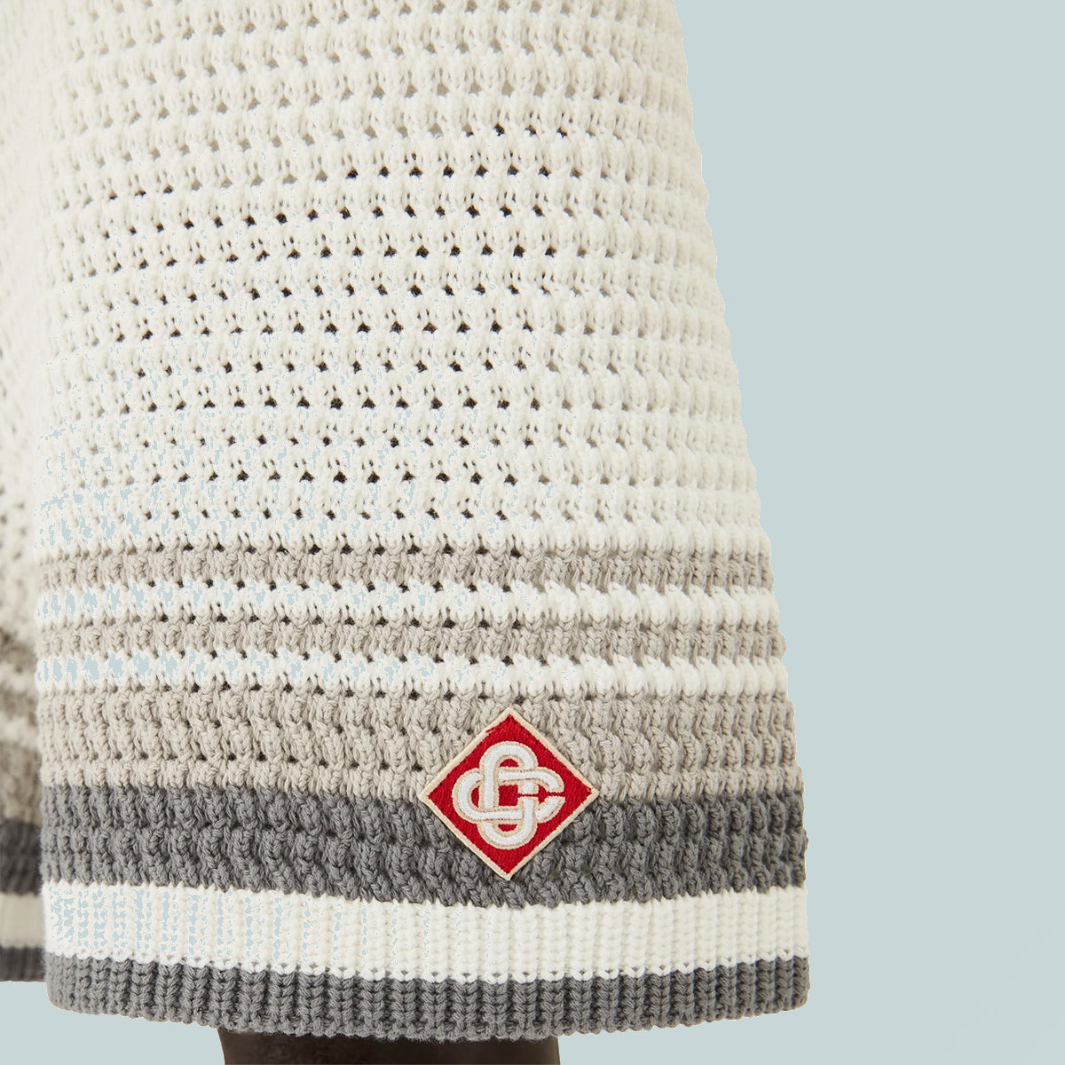 The tennis crochet shorts are a soft textured design crafted from a knitted organic cotton fabric, featuring the house's signature diamond logo. Finished with a ribbed elasticated waistband with drawstring fastening, side pockets, and contrast stripe detail on the legs.