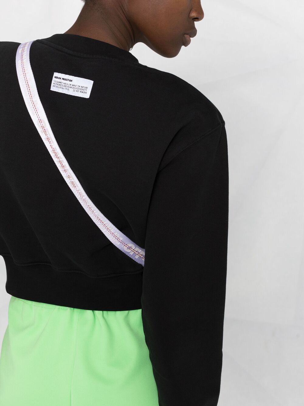 Black crewneck sweatshirt with warped Heron Preston logo in white at chest. Cropped. Mid-weight fabric. Cut for loose fit. Made in Italy.