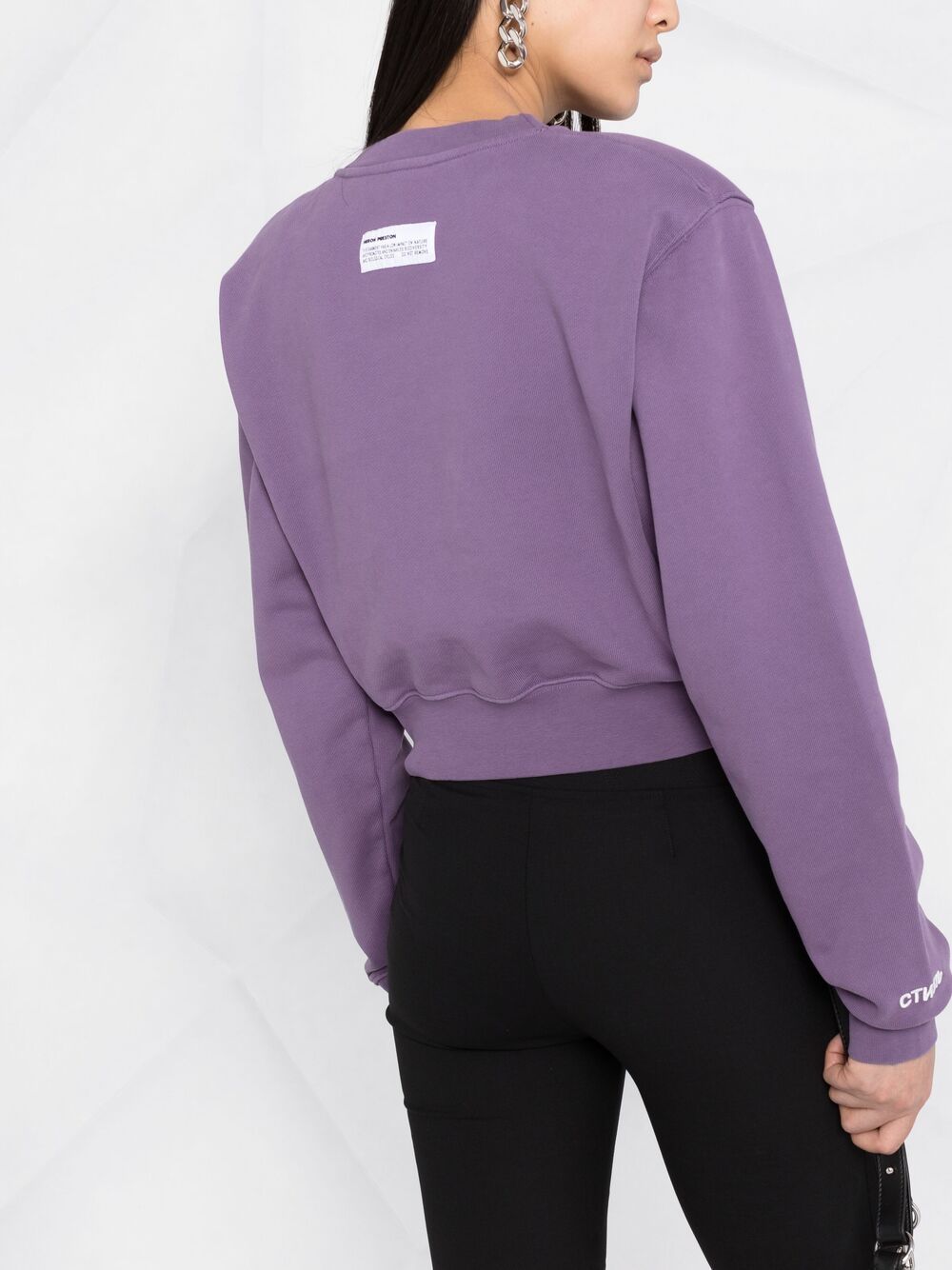 Purple crewneck sweatshirt with warped Heron Preston logo in white at chest. Cropped. Mid-weight fabric. Cut for loose fit. Drop shoulders. Elasticated cuffs. Made in Italy.