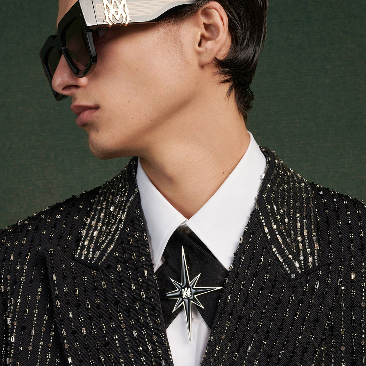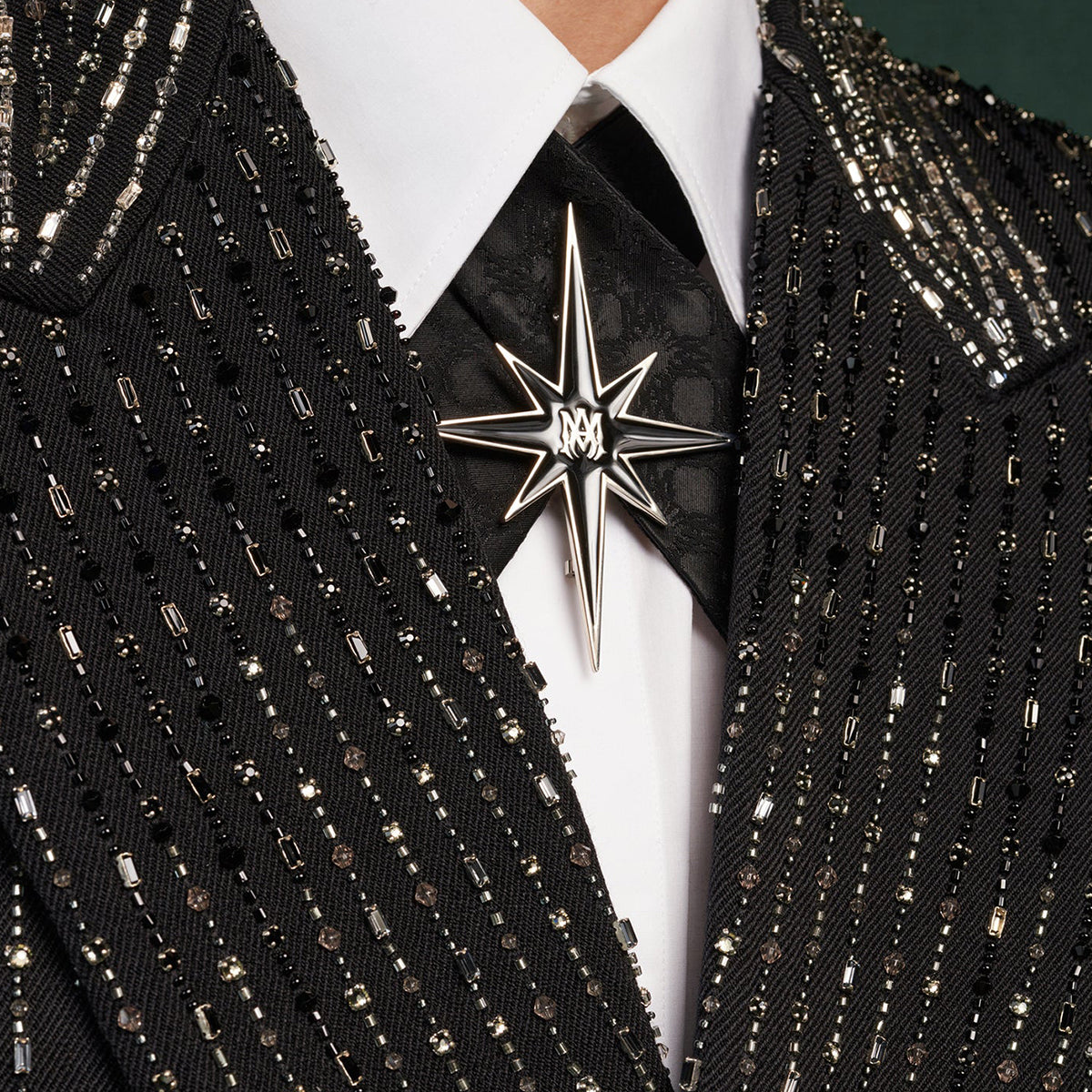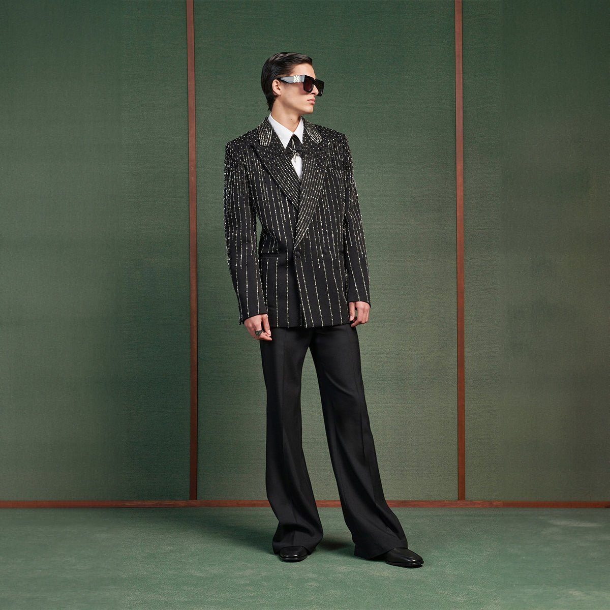 For Spring-Summer 2025, hand-placed crystals, beads, and sequins illuminate house signature tailoring silhouettes in a striped gradient effect. The Crystal Stripe Double Breasted Blazer is crafted with a wide notched lapel, welt pockets, and covered button closure.