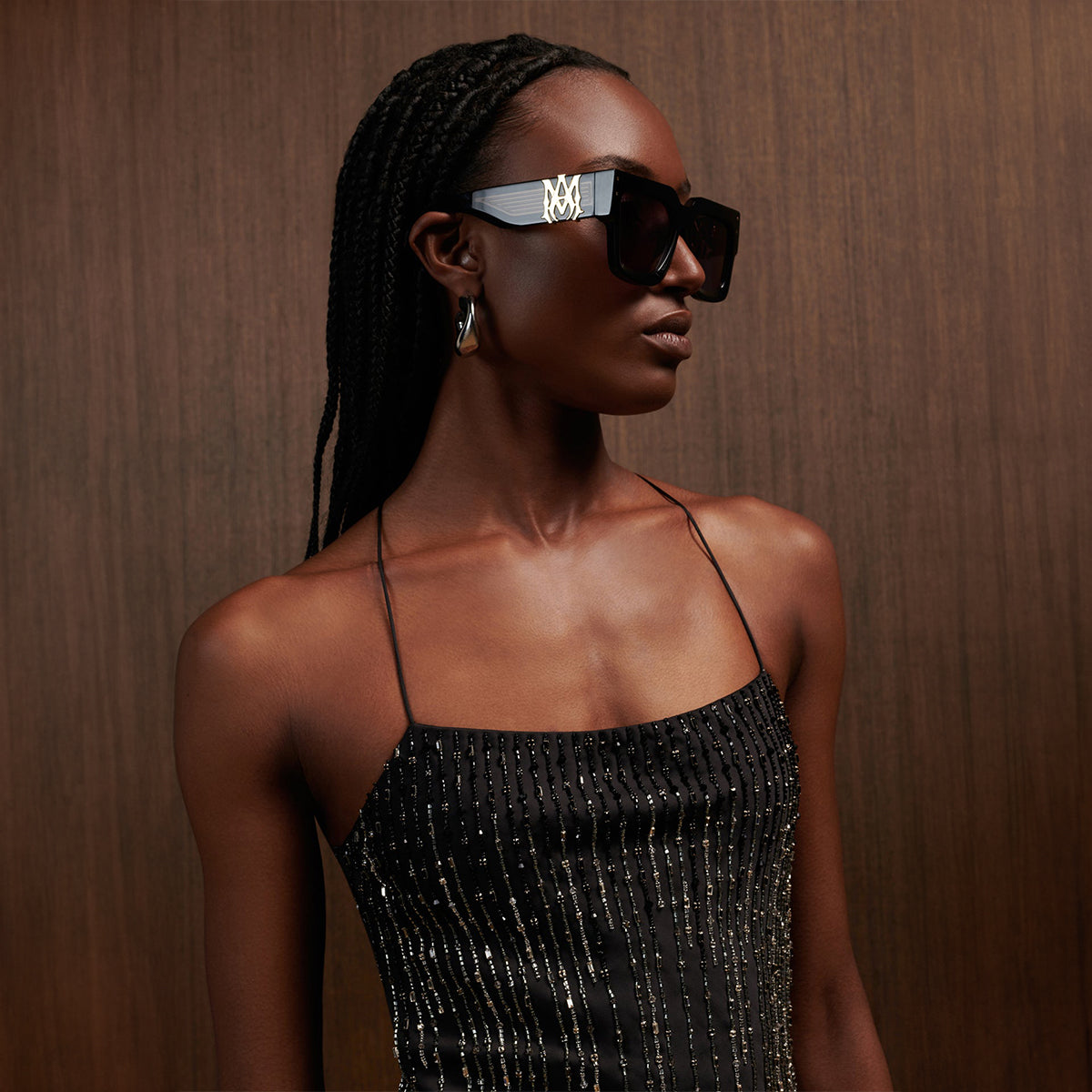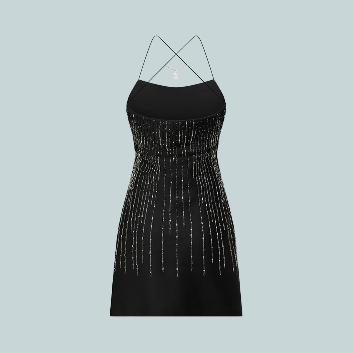 For Spring-Summer 2025, hand-placed crystals, beads, and sequins illuminate womenswear silhouettes in a striped gradient effect. The Crystal Stripe Mini Dress is designed with an open back featuring MA icon hardware suspended from a silver chain.
