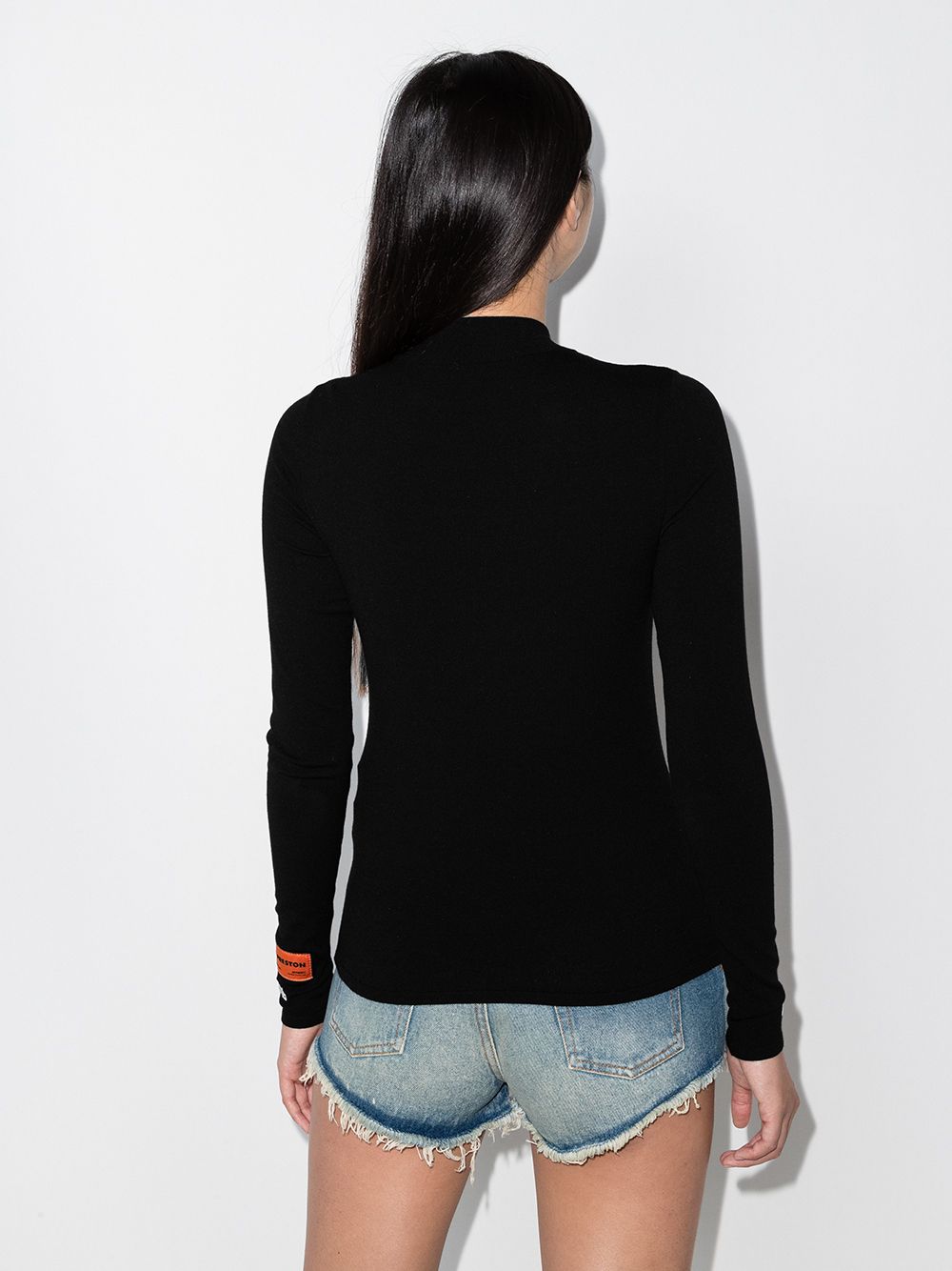Long sleeved high neck top in black featuring СТИЛЬ embroidered logo at neck and sleeves. Orange logo patch sewn at sleeve.