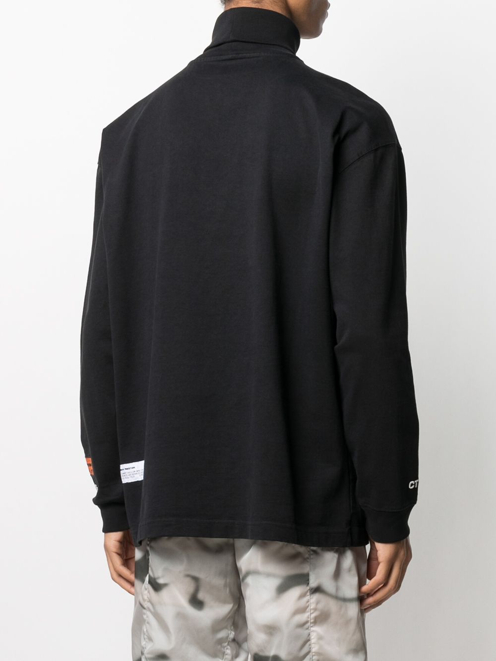 A black organic cotton long sleeve with a high roll neck accented with a СТИЛЬ slogan and complemented by a logo print to the rear and patch to the sleeve. Drop shoulder. Cut for a loose fit.