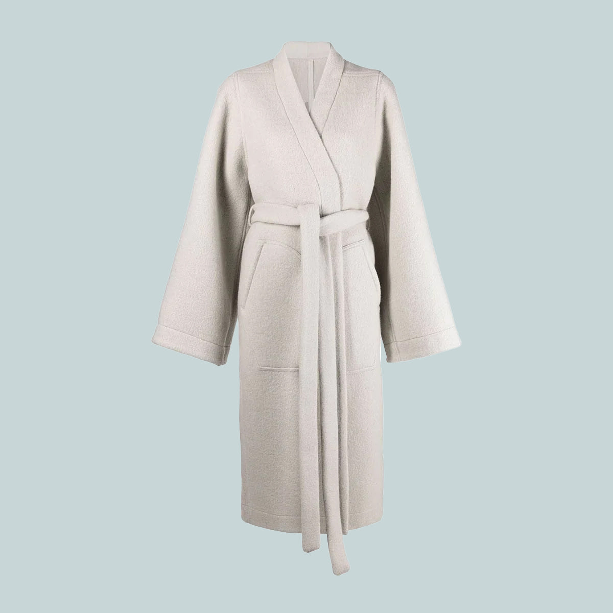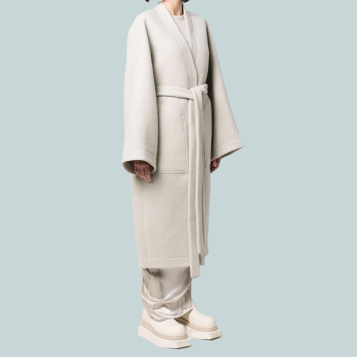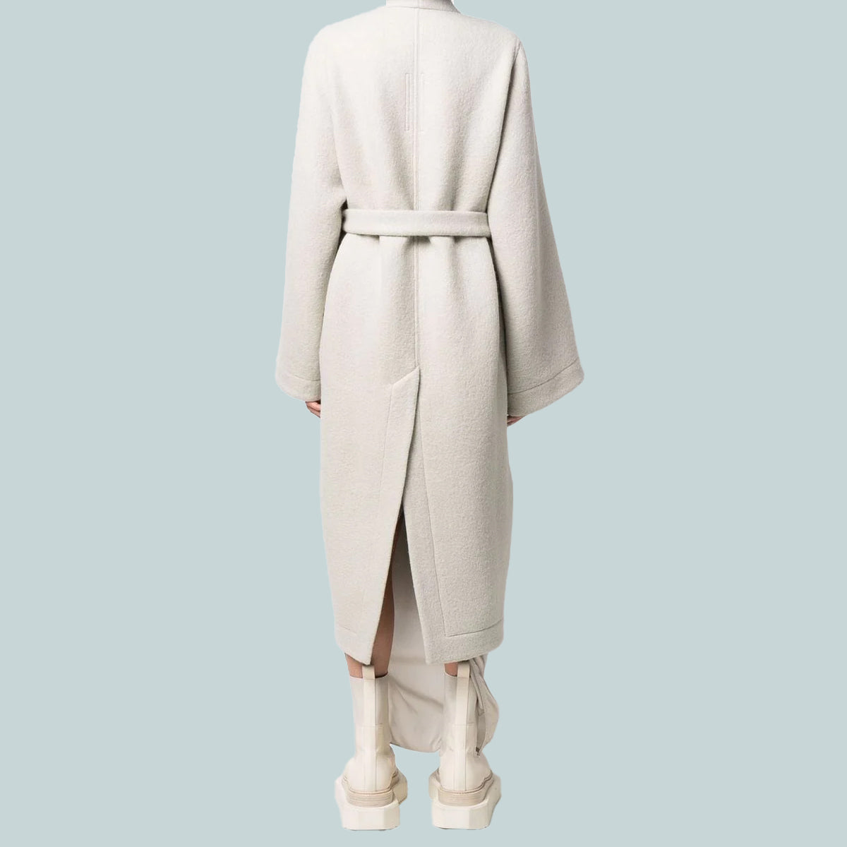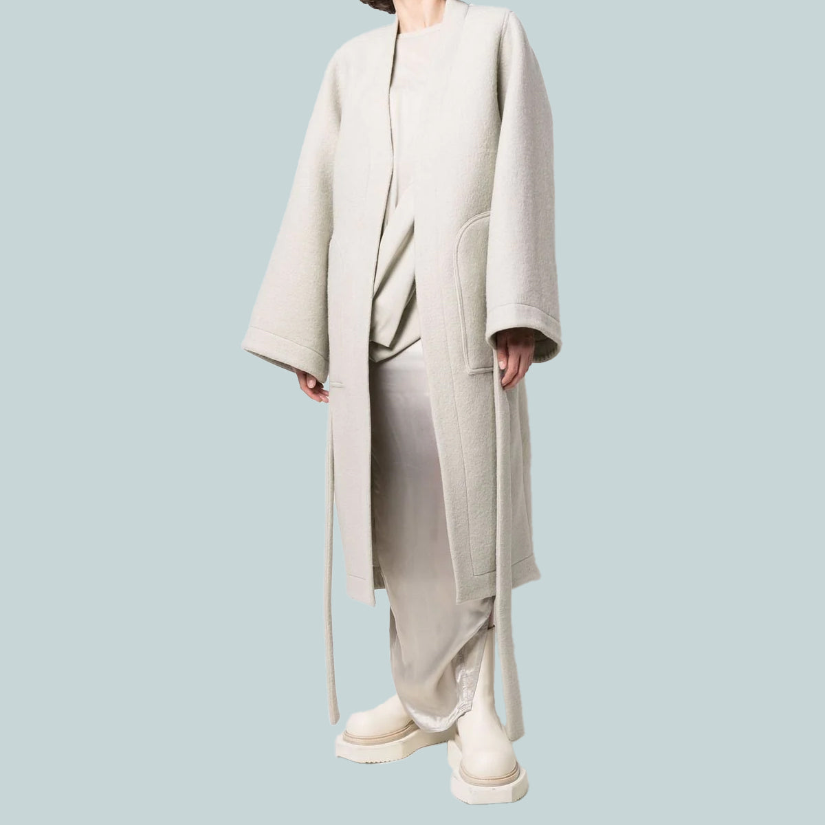 RICK OWENS FW22 Strobe Dagger robe in Pearl alpaca wool felt. A below the knee length coat with a loose fit and flared sleeves. Wrap front style creates a v neck and closes with wrap tie. Rounded bauhaus pockets with topstitching. Dense heavyweight wool coating with brushed felted finish.