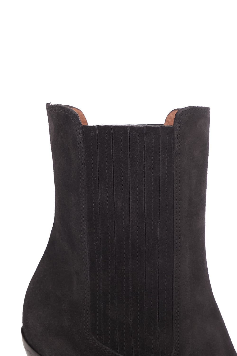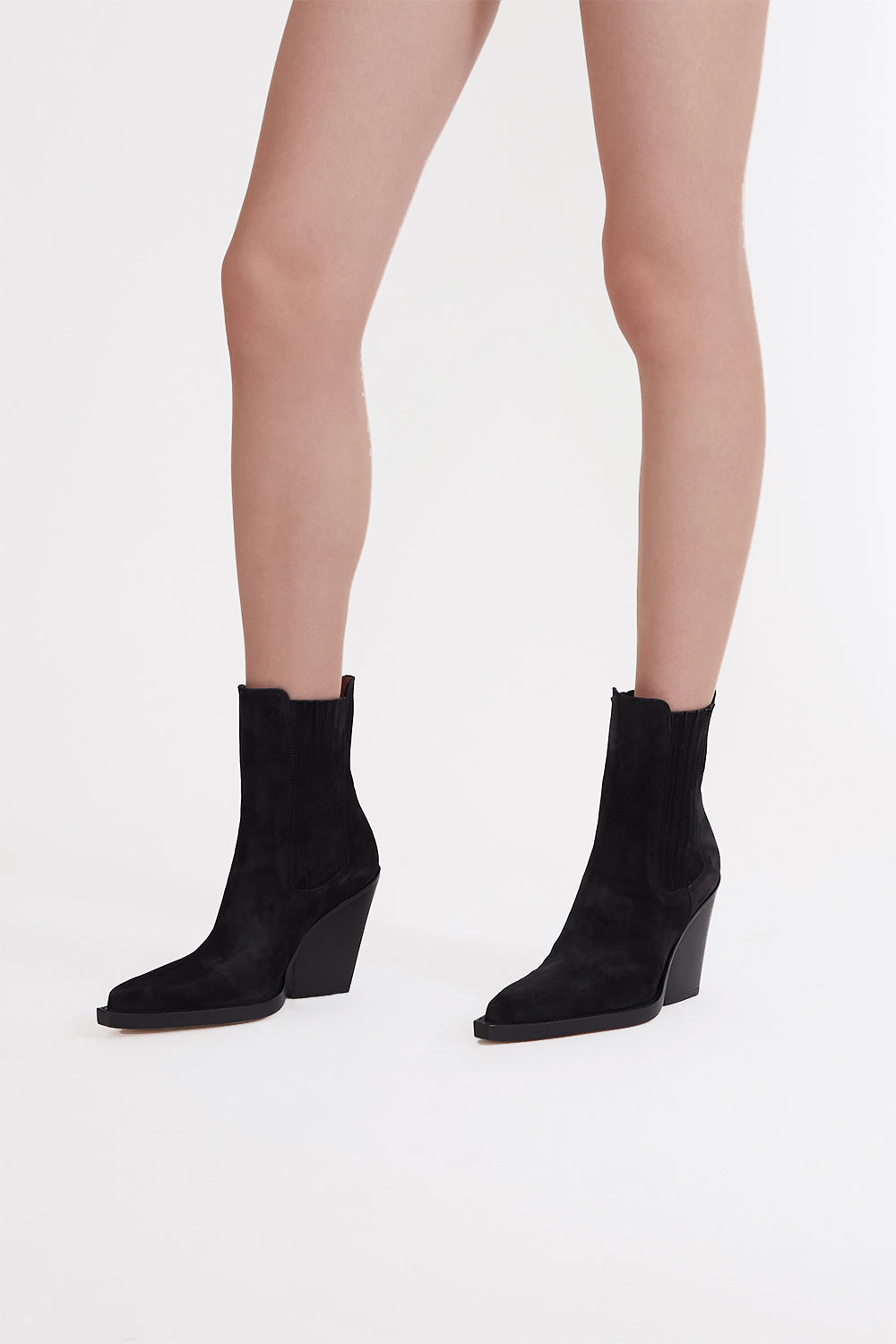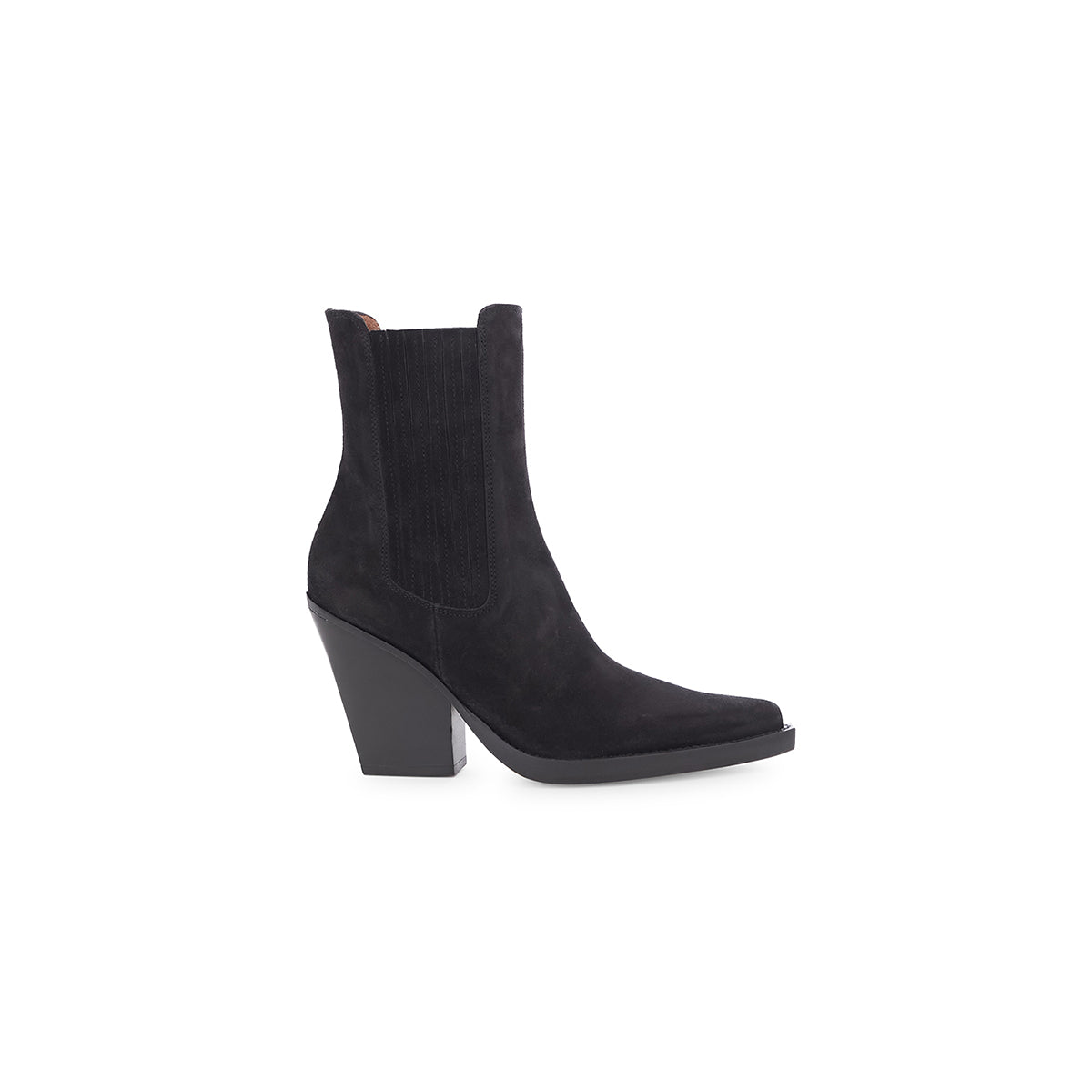 Ankle height boot in black suede leather. Designed and crafted in Italy. Block heel of approximately ..cm. Squared pointed toe. Slip on entry.