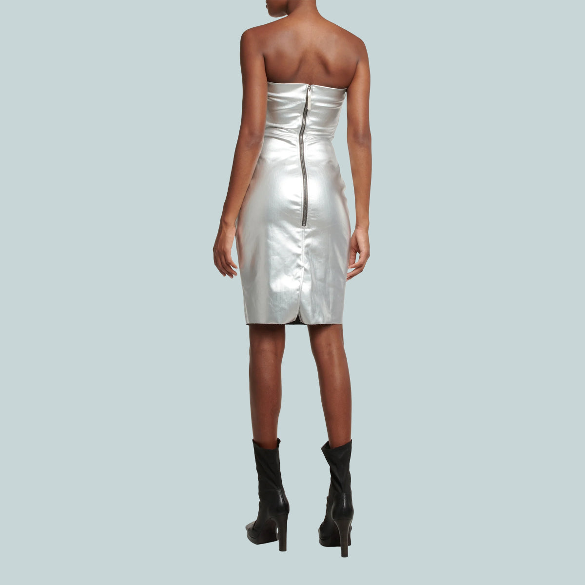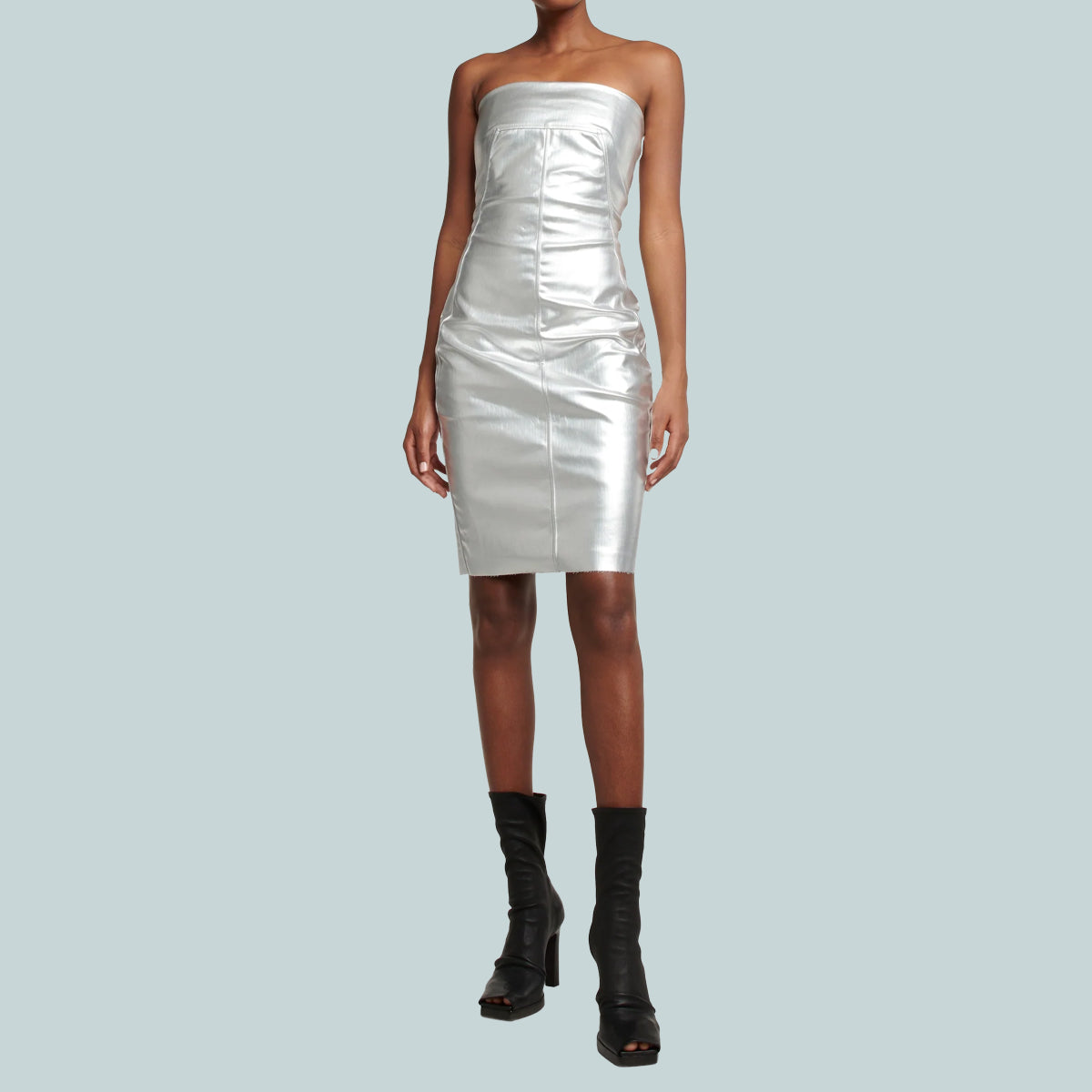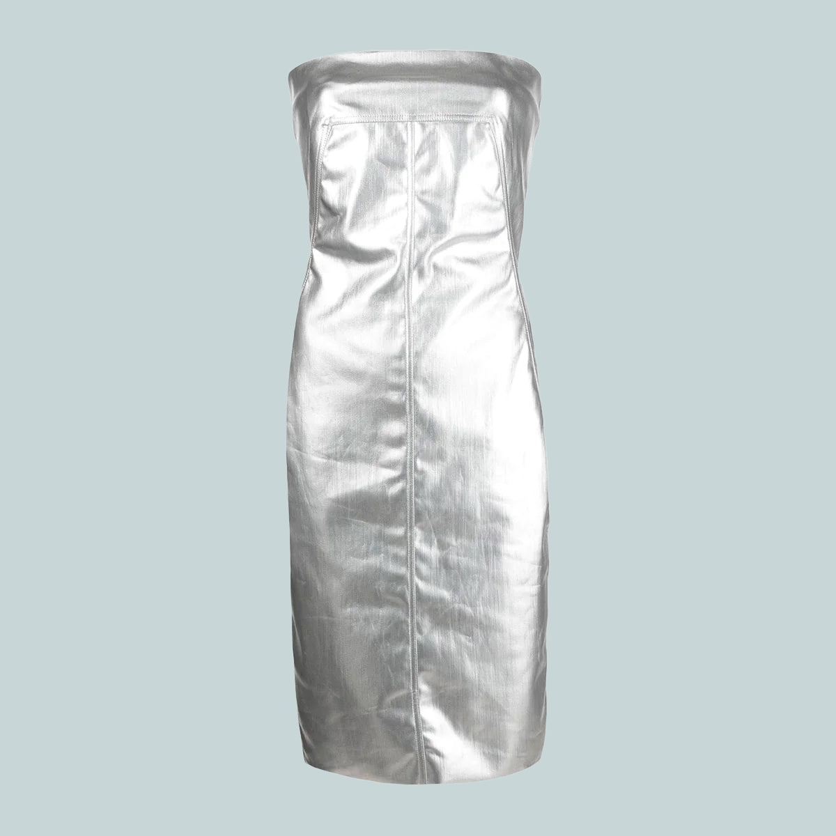 Coated denim bustier dress from the Rick Owens FW22 Strobe collection. A metallic strapless mid length dress with seam detailing and a figure-hugging silhouette.