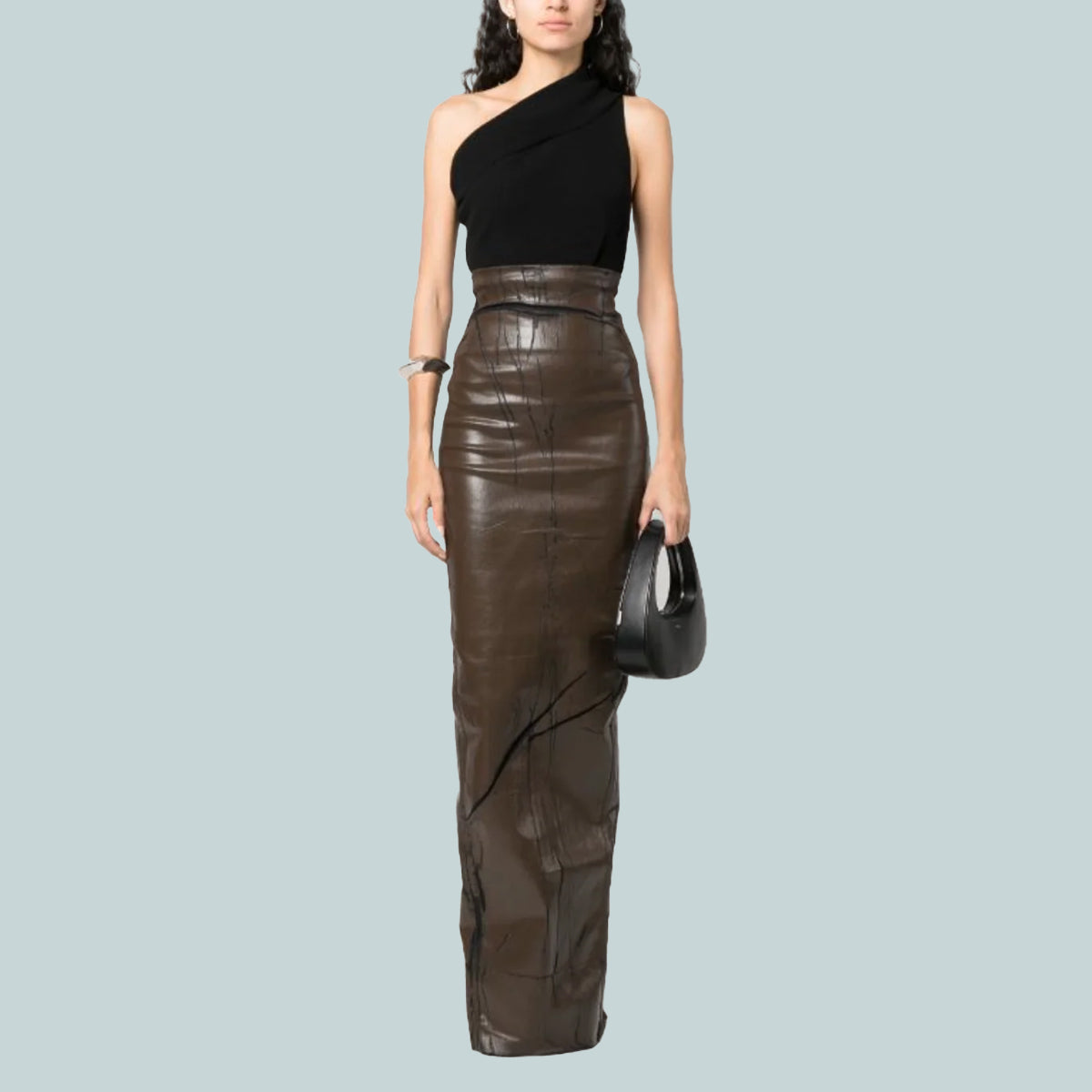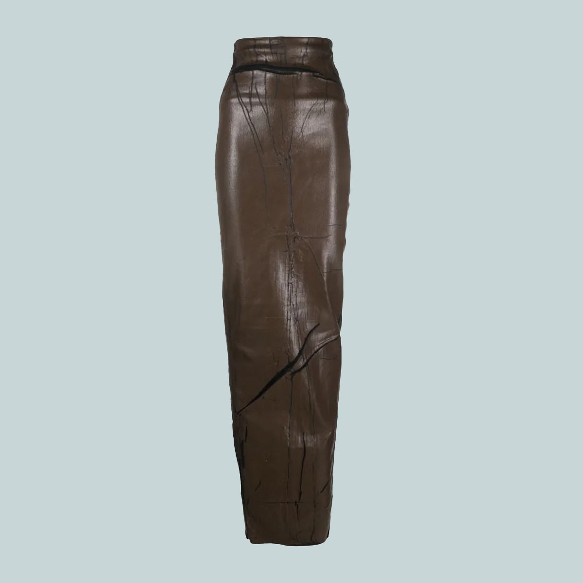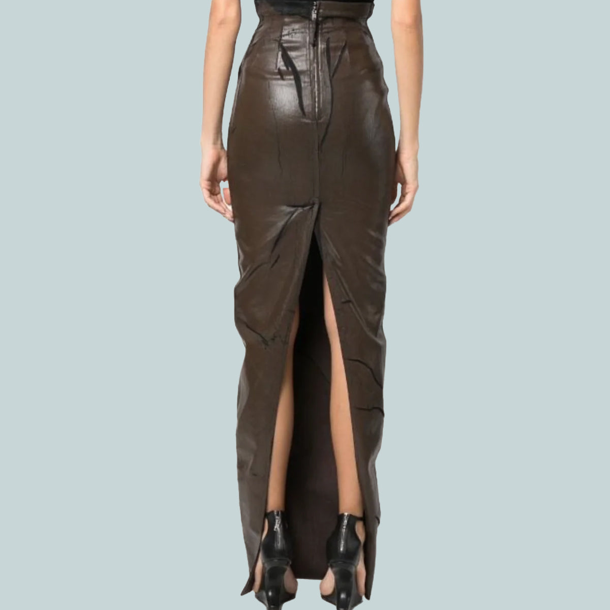 This dirt pillar skirt is ankle length with a tight fit. it has an extra high waist with back zipper, a tapered skirt with raw cut hem and a slit in the centre back seam, up to the knee.