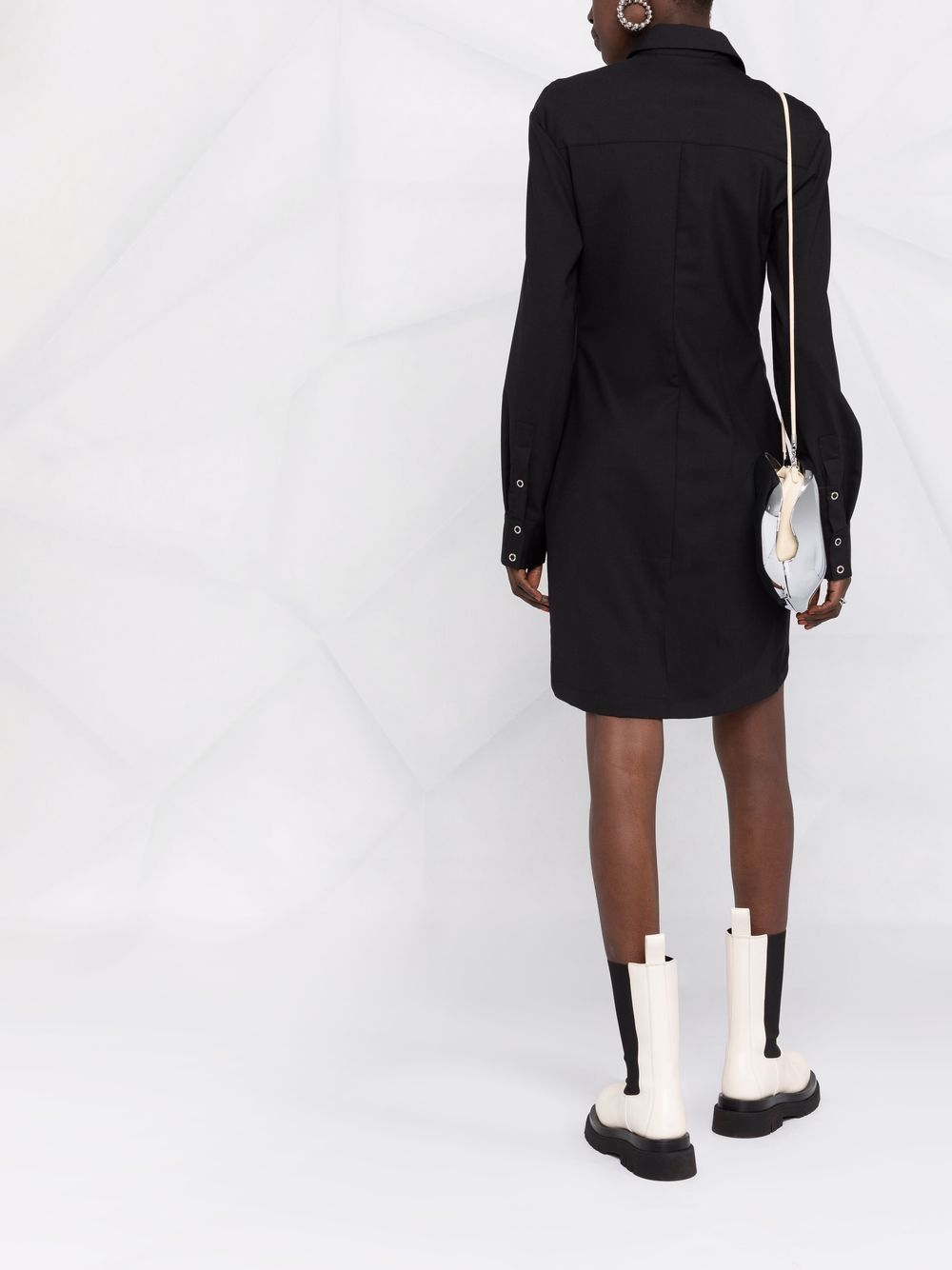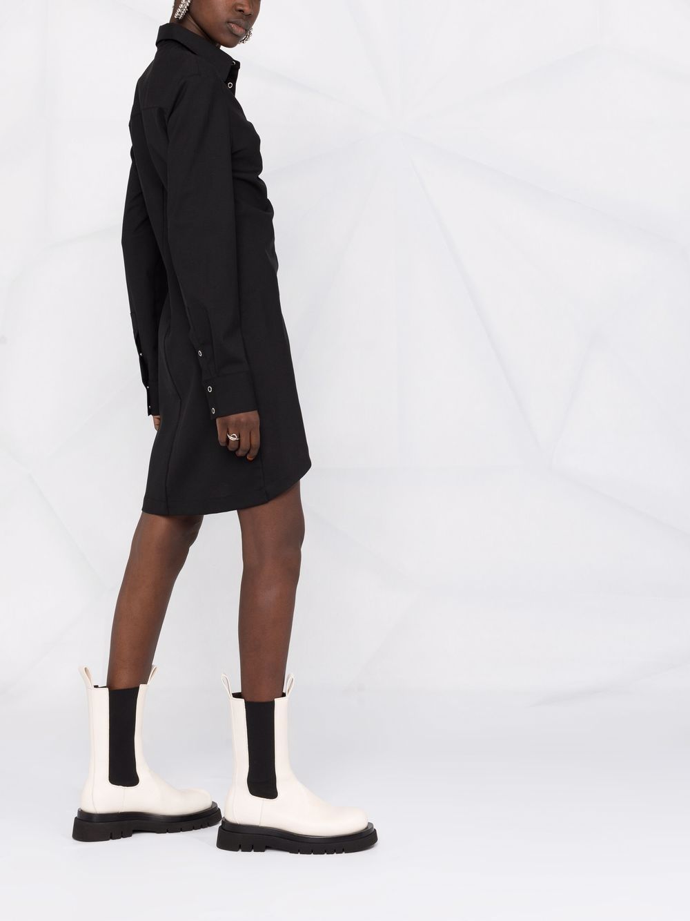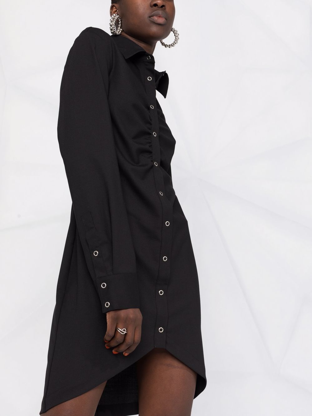 Black shirt dress from Heron Preston. Gathered detailing down the front button closures give this dress a contemporary edge. Asymmetric hem from short to mid length. Classic collar. Long sleeves. Snap button closures.