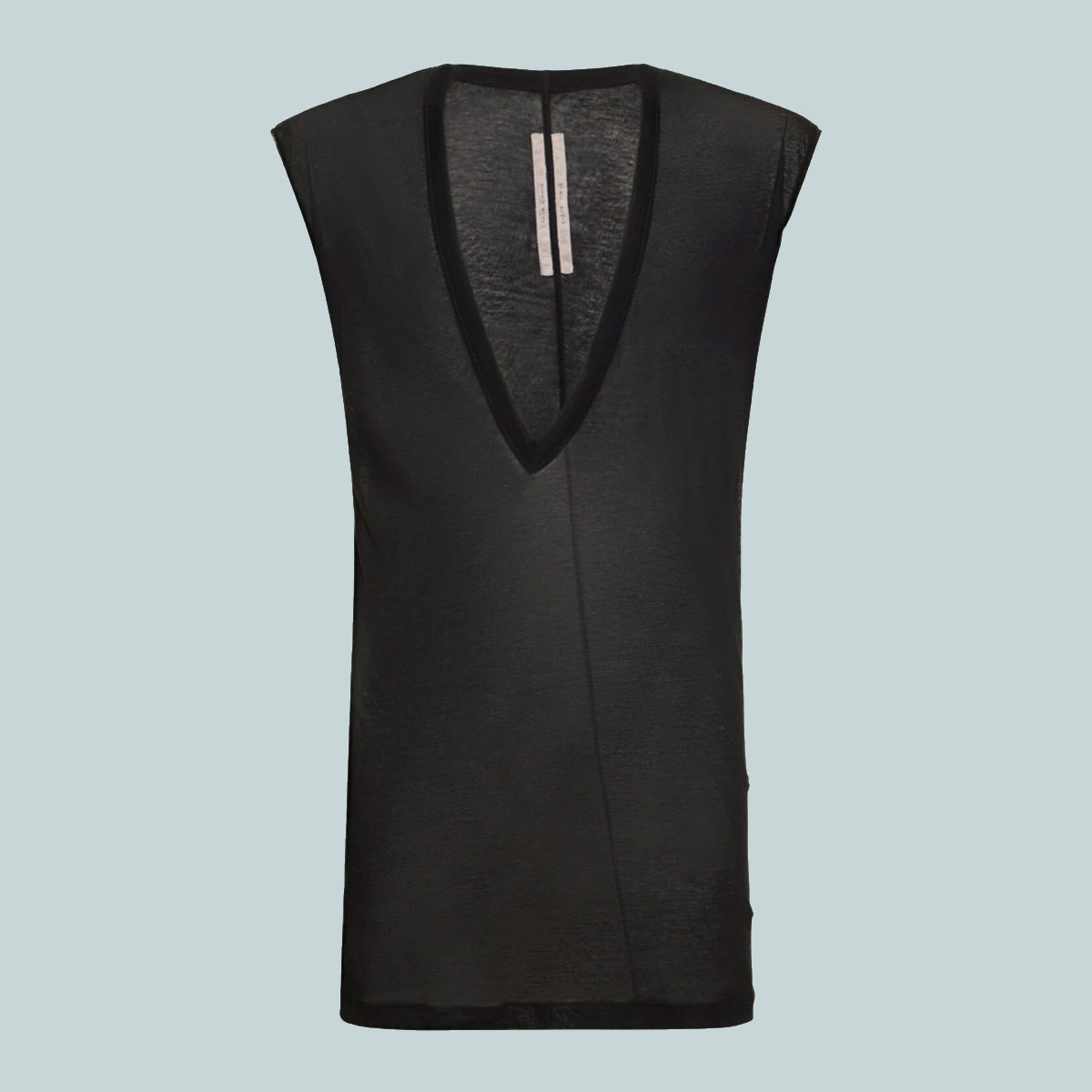 This dylan t is below hip length. it has an extreme deep v neck with a raw cut hem and reinforced raw cut, wide, tank shoulders. it features the signature single seam running down the centre back spine.
