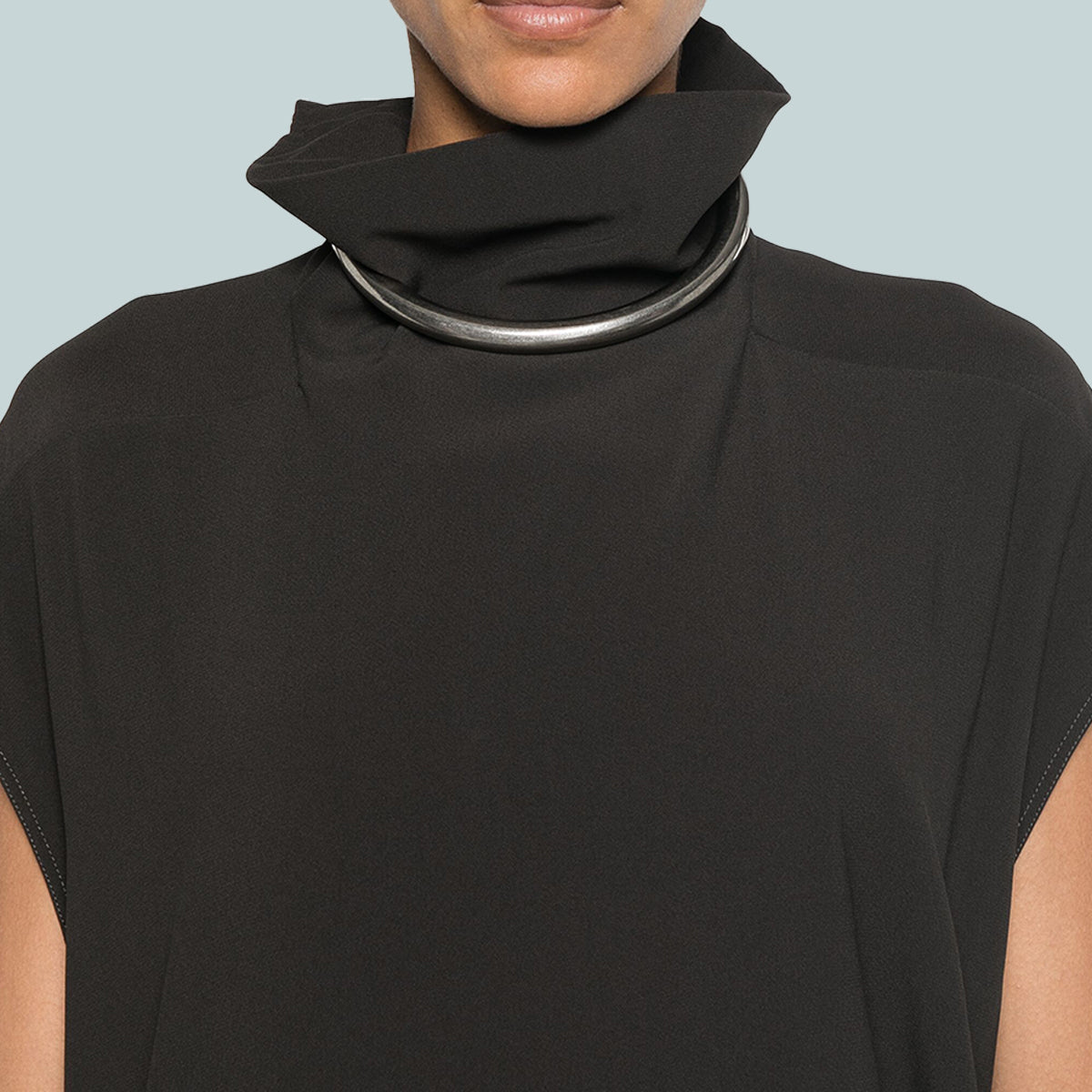 This edfu t dress trails floor length with a square, loose fit. it is sleeveless with wide square shoulders and level shoulder seams. it has a high neck with centre back button opening, and features a skirt that slopes from a split, high on the right thigh, tapering into a long train.