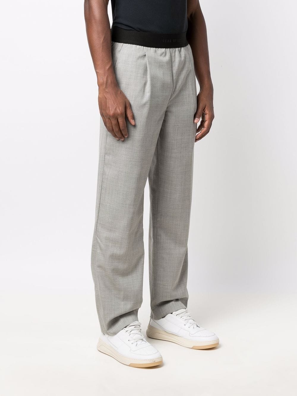 Showcasing Fear of God's minimalist aesthetic, these grey straight-leg trousers are simply detailed with a black branded elasticated waistband. Two side slit pockets and two rear welt pockets.