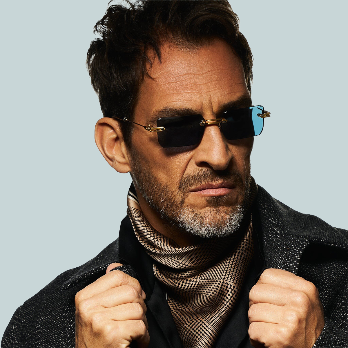 Beta Titanium Construction featuring modular vented components with 18K gold electroplating, along with flex temple systems adorned with cellulose adjustable acetate temple tips and two-tone decors at each end. Detailed and hand finished two-tone Monoblock connections. Custom 4mm Rimless lens features a Hand-Painted matte edge finish, finished with both Anti-Reflective and Scratch Resistant coatings, drilled and notched to accommodate titanium components.