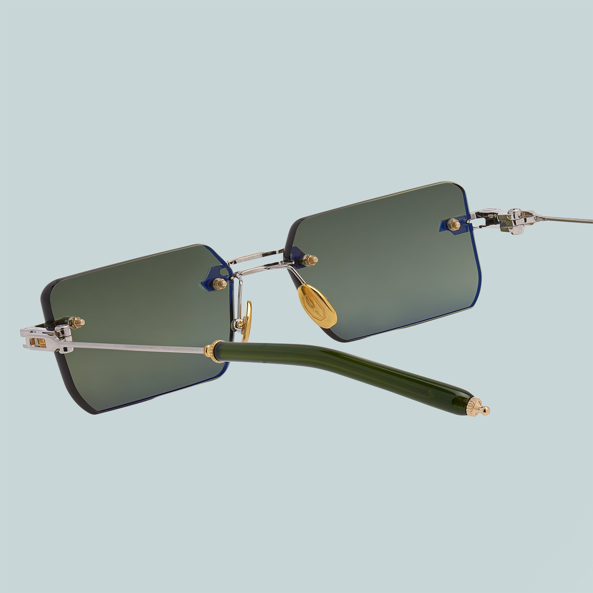 Beta Titanium Construction featuring modular vented components with 18K gold electroplating, along with flex temple systems adorned with cellulose adjustable acetate temple tips and two-tone decors at each end. Detailed and hand finished two-tone Monoblock connections. Custom 4mm Rimless lens features a Hand-Painted matte edge finish, finished with both Anti-Reflective and Scratch Resistant coatings, drilled and notched to accommodate titanium components.