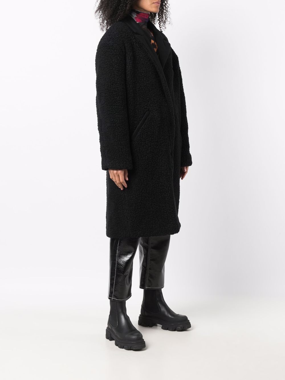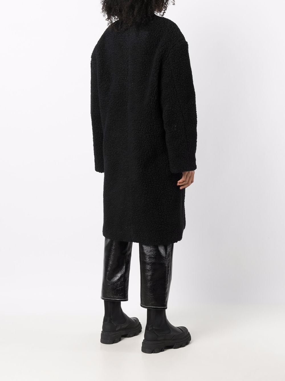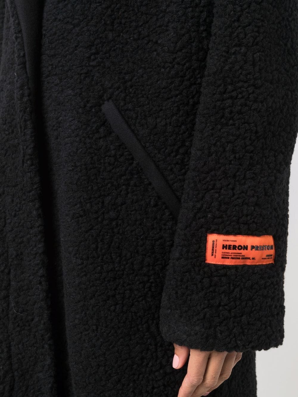 Single-breasted coat in tonal black from Heron Preston. Made with virgin wool, this shearling fleece coat will be your wardrobe staple through the winter. Peaked lapels and concealed front fastening. Dropped shoulders. Signature orange logo patch at the sleeve.