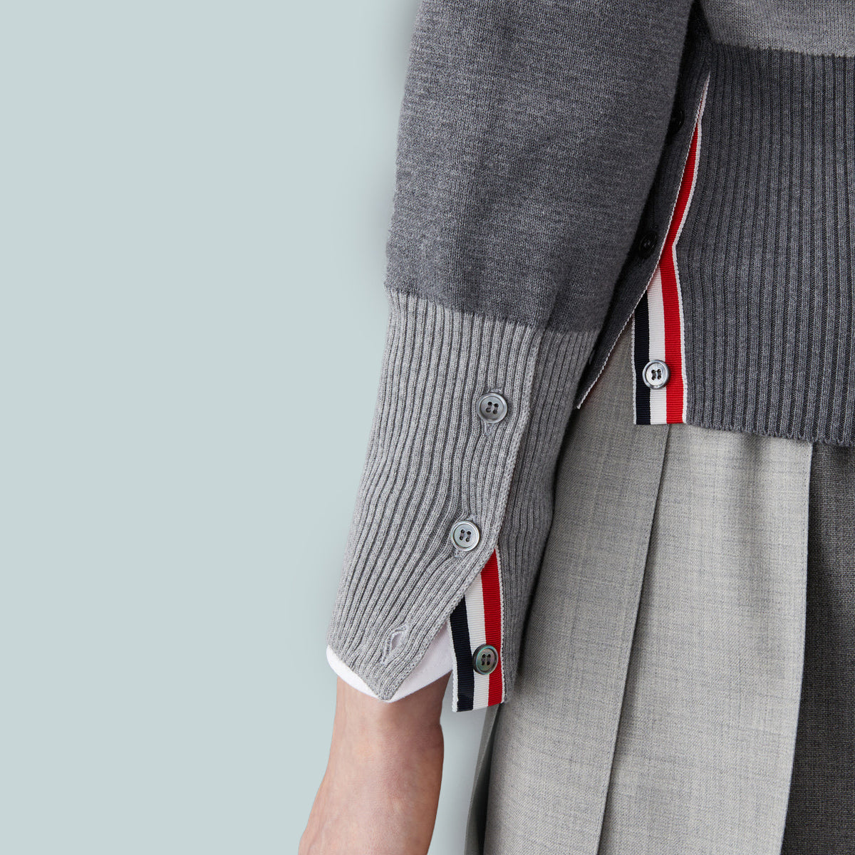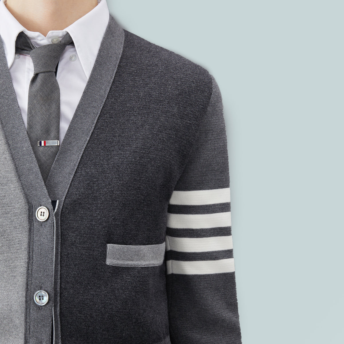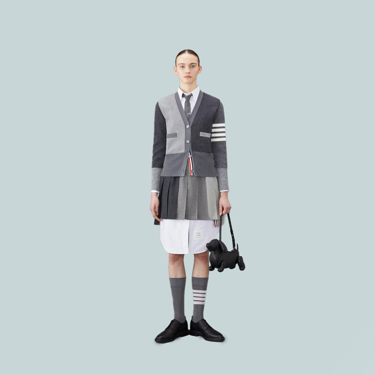 Our Fun-Mix Crepe 4-Bar Cardigan. Shades of fine cotton are woven together in patchwork form amidst two signature Thom Browne emblems 4-Bar stripes and grosgrain ribbon.