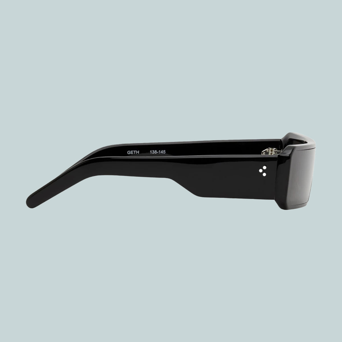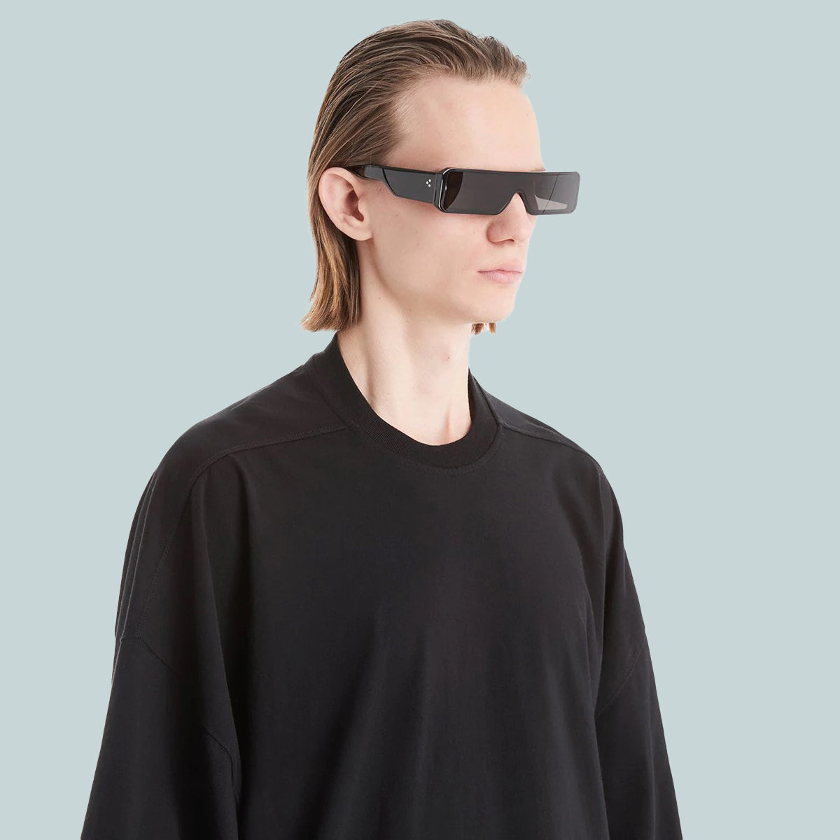 Rick Owens Geth sunglasses. Sleek and slim rectangular geometric frames with a single cut lens and wide arms