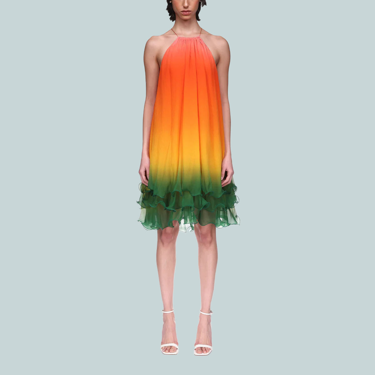 The Rainbow Gradient cocktail dress is a sleeveless design crafted from silk crepe fabric, featuring three layers of the season's rainbow gradient print representing the rich exchanges across cultural disciplines in African art, music and film. Completed with a halter neck with string fastening.